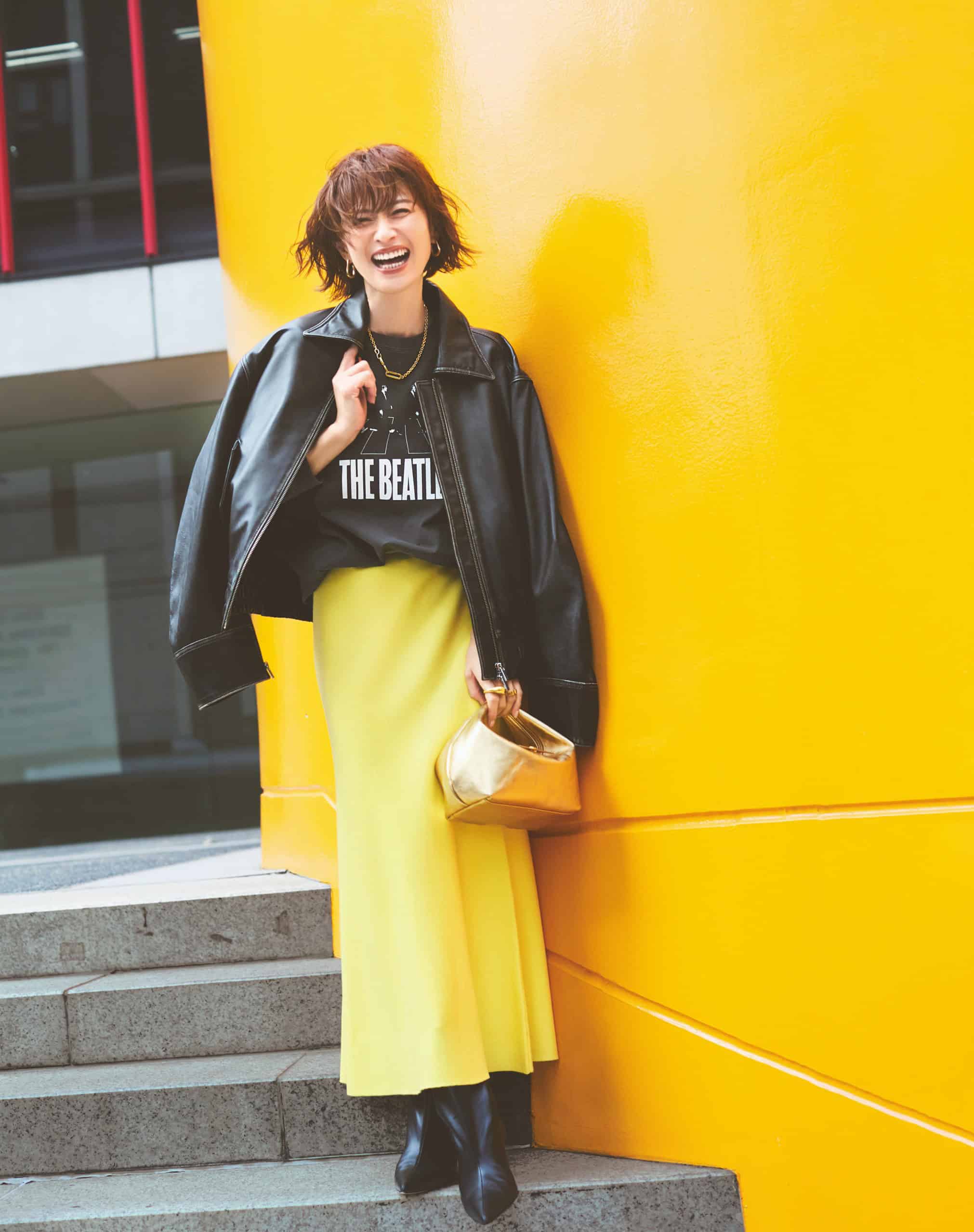 黒レザーJKの辛さを、ハツラツとしたイエローのIラインスカートで中和。ロックTのカジュアル感とも好相性で、黒が主張しすぎず整います。縦ラインを意識したシルエットがすっきり感も後押し。色の力で黒アウターを今っぽく引き上げる、多幸感抜群の着こなしです。