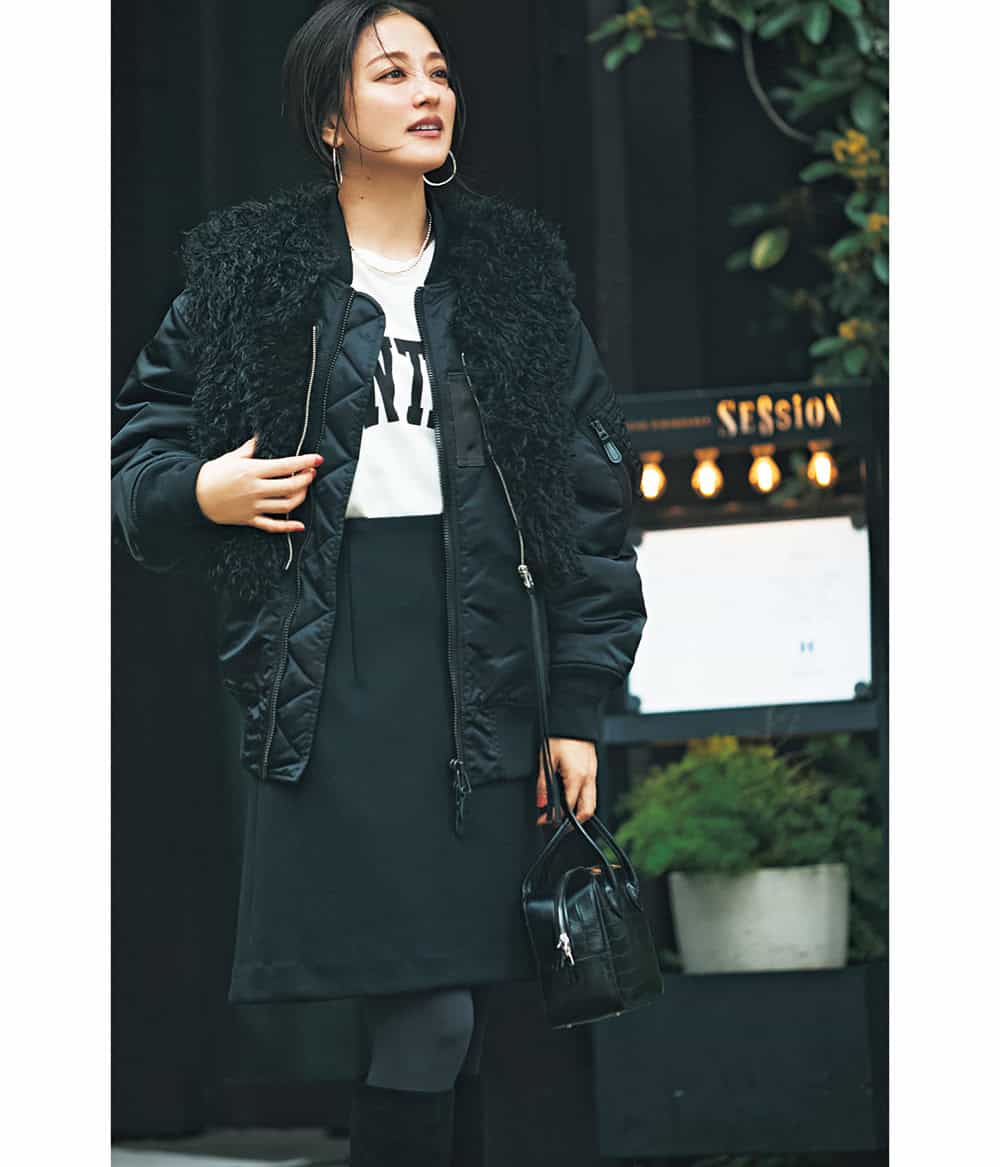 ボアベスト¥22,000(メゾンスペシャル/メゾンスペシャル 青山店)MA-1¥88,000(ハイク/ボウルズ)カットソー¥14,300(ウィム ガゼット/ウィム ガゼット 玉川髙島屋S・C店)スカート¥39,600(エムティーモデリスト/ロンハーマン)バッグ¥82,500(メゾン カナウ/ヤマニ)ブーツ¥110,000(ネブローニ)ピアス¥26,400(ブランイリス/ブランイリス トーキョー)ネックレス¥50,820(バルブス/ズットホリック)タイツ¥1,650(靴下屋/タビオ)