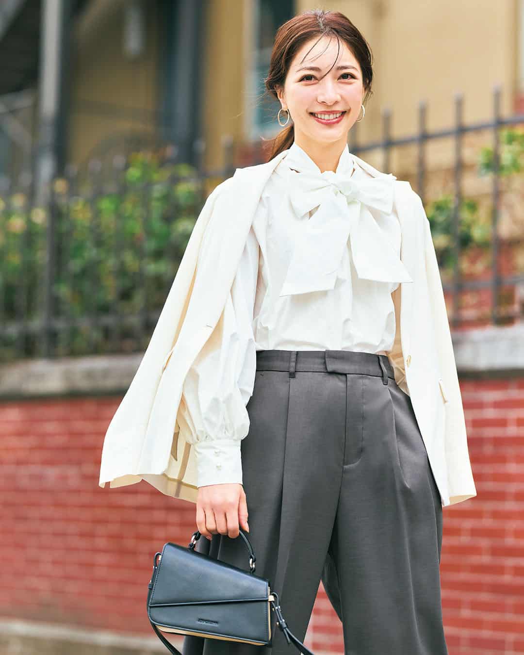 ブラウス¥17,600(スリースクエア)ジャケット¥18,920(インディヴィ)パンツ¥24,200(アルページュストーリー)バッグ¥22,000(アドカラム/アンソロジー)ピアス¥14,300(ウノアエレシルバーコレクション/ウノアエレ ジャパン)