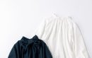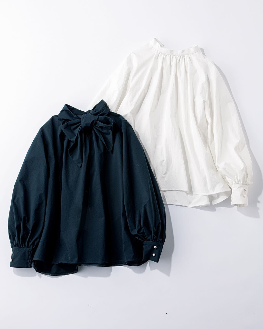 ホワイトにはブラックのタイ、ネイビーには同色のタイが付属。タイを外してもパールやパフスリーブの盛りデザインで地味見えしません。ジャスト丈なので、デニムなどカジュアルなボトムスとも相性抜群。