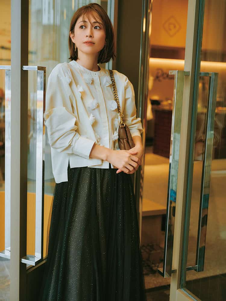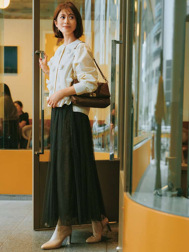 ③「チュールシャツ」1枚あれば華やかコーデが完成!