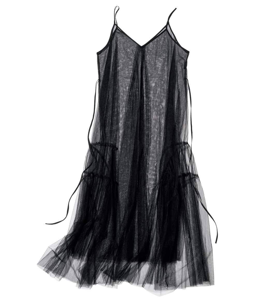 全身にレースを重ねる大胆コーデもチュールレースのワンピならさりげなく大人っぽい。ほぼクロで安心感ある仕上がりに。