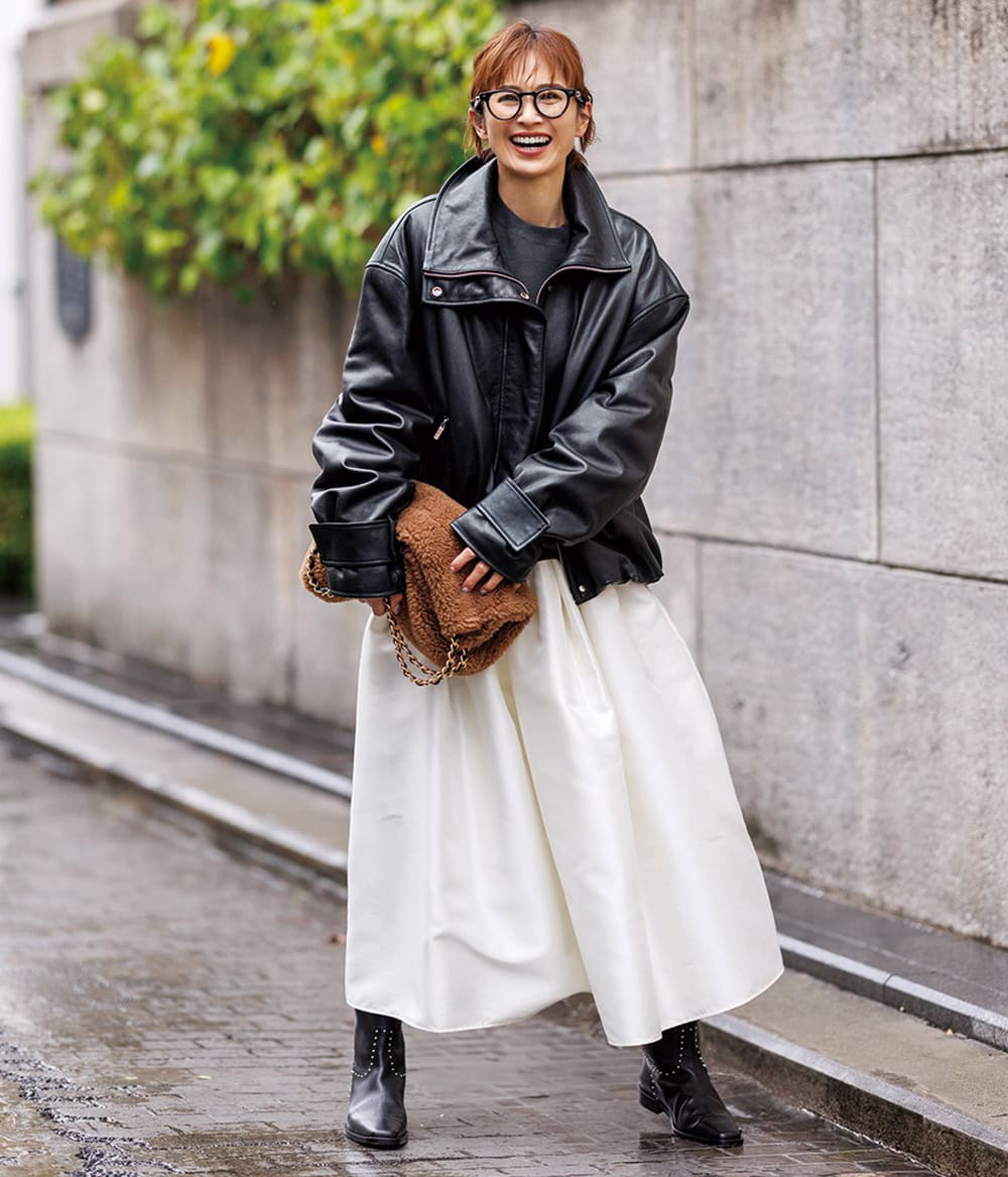 今どきのレザーシルエットが白のふんわりスカートの鮮度アップに効果的。