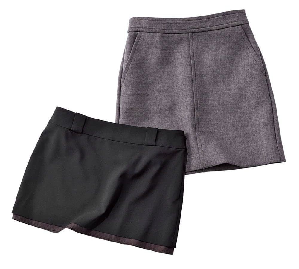 〈上から〉落ち着いた色味で柔和な表情に。スカート¥44,000(オブリオ)パンツの上に穿いてスカパンとしても活躍。スカート¥38,500(ユナス/エストネーション)