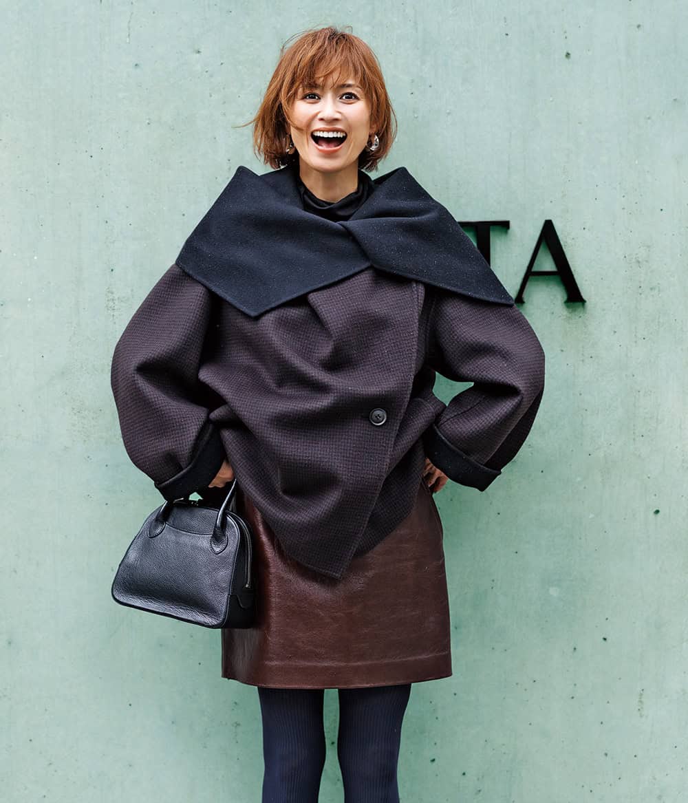 スカート¥59,950(エイチ ビューティー&ユース)コート¥154,000(デパリエ/デパリエ 伊勢丹新宿店)中に着たニット¥4,990(プラステ)バッグ¥68,200(メゾン カナウ/ヤマニ)ピアス¥69,300(ウノアエレシルバーコレクション/ウノアエレ ジャパン)タイツ¥2,520(靴下屋/Tabio)