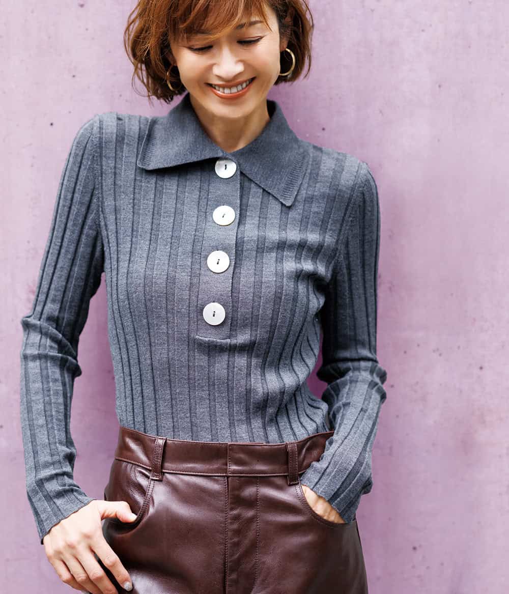 ともすると埋もれがちなポロニットですが、顔まわりが華やぐディテールで好印象をキープ。いざという時のママ友ランチに重宝しそうです。