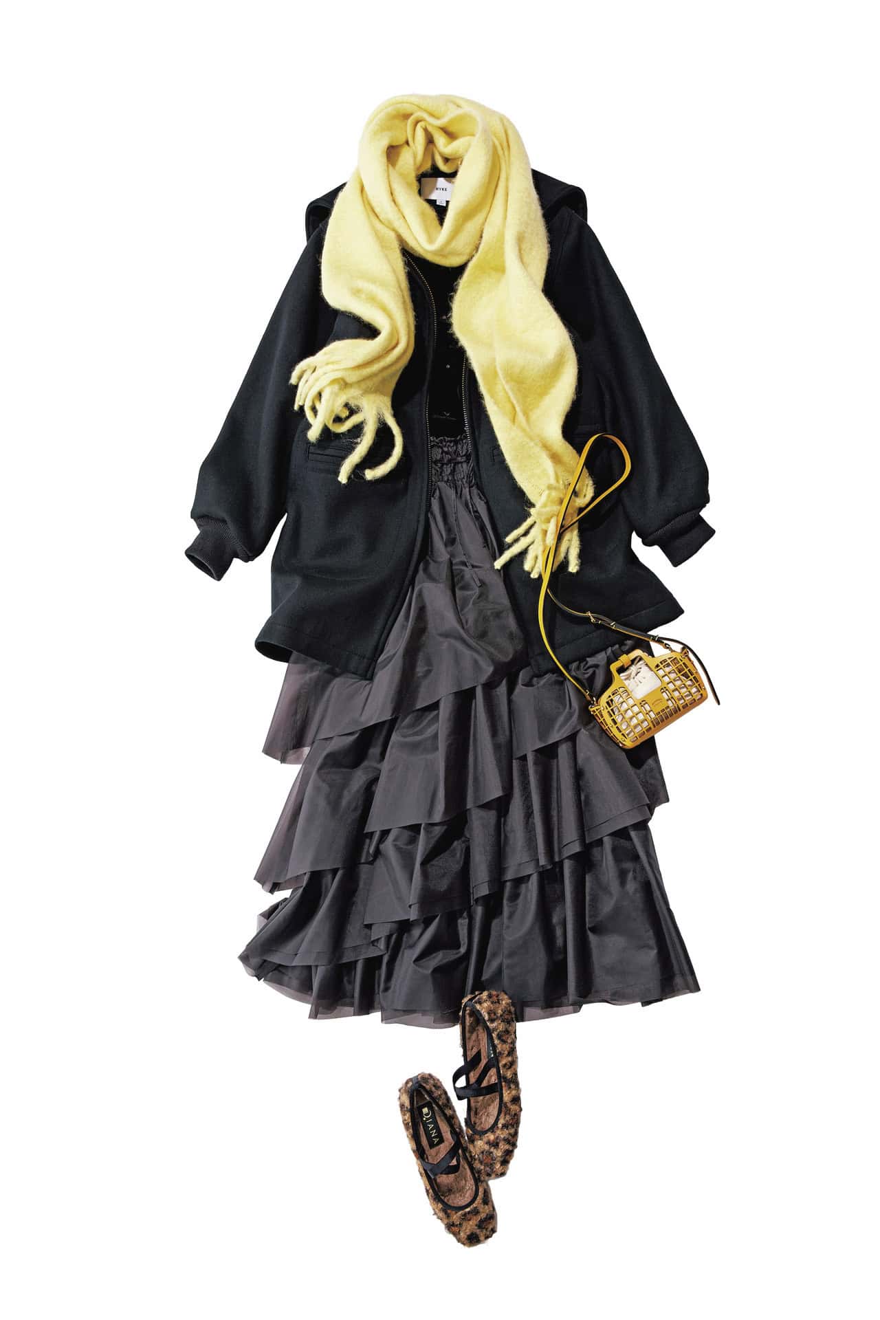 バターイエローのもこもこマフラーを主役にしたコーデは、顔まわりに血色と可愛げをプラス。黒コート×ダークトーンスカートも、ティアードデザインなら甘さをキープします。防寒しながら若々しさも守れる、冬に効く配色テクニックです。