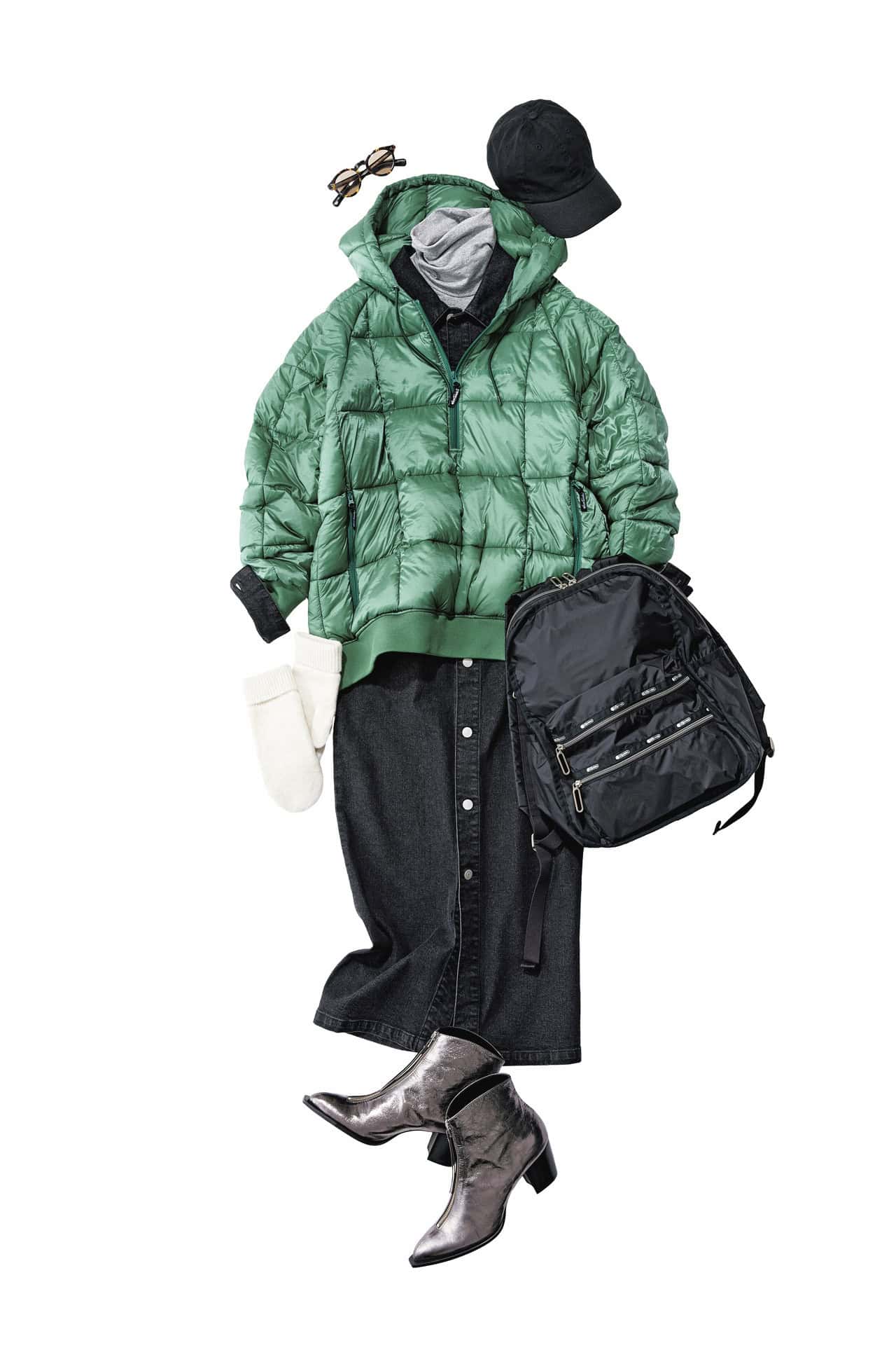 アノラック¥39,600(ワイルドシングス × シンゾーン/シンゾーン ルミネ有楽町店)デニムワンピース¥44,000(ウィム ガゼット/ウィム ガゼット 玉川髙島屋S・C店)タートルネックカットソー¥20,900(オットダム/パサージュ ドゥ ストックマン 恵比寿店)バックパック¥29,700(レスポートサック/レスポートサック カスタマーサービス)ブーツ¥44,000(銀座かねまつ/銀座かねまつ6丁目本店)サングラス¥47,300(アイヴァン/アイヴァン 東京ギャラリー)キャップ¥7,700(アストラット/アストラット 新宿店)ニットミトン¥1,990(ユニクロ)