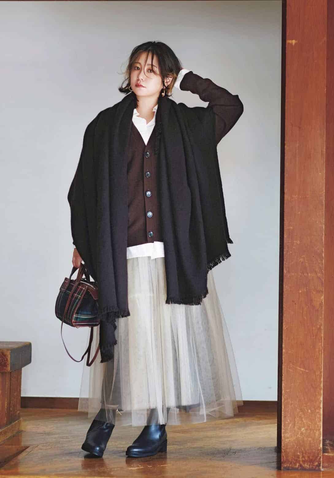 同系色のストールとカーディガンを重ねた、奥行きのある上品コーデ。ストールでしっかり防寒しながら、体のラインを拾わず柔らかなシルエットに。白シャツ×チュールスカートの軽やかさは、冬コーデに女性らしい華やぎをプラスします。