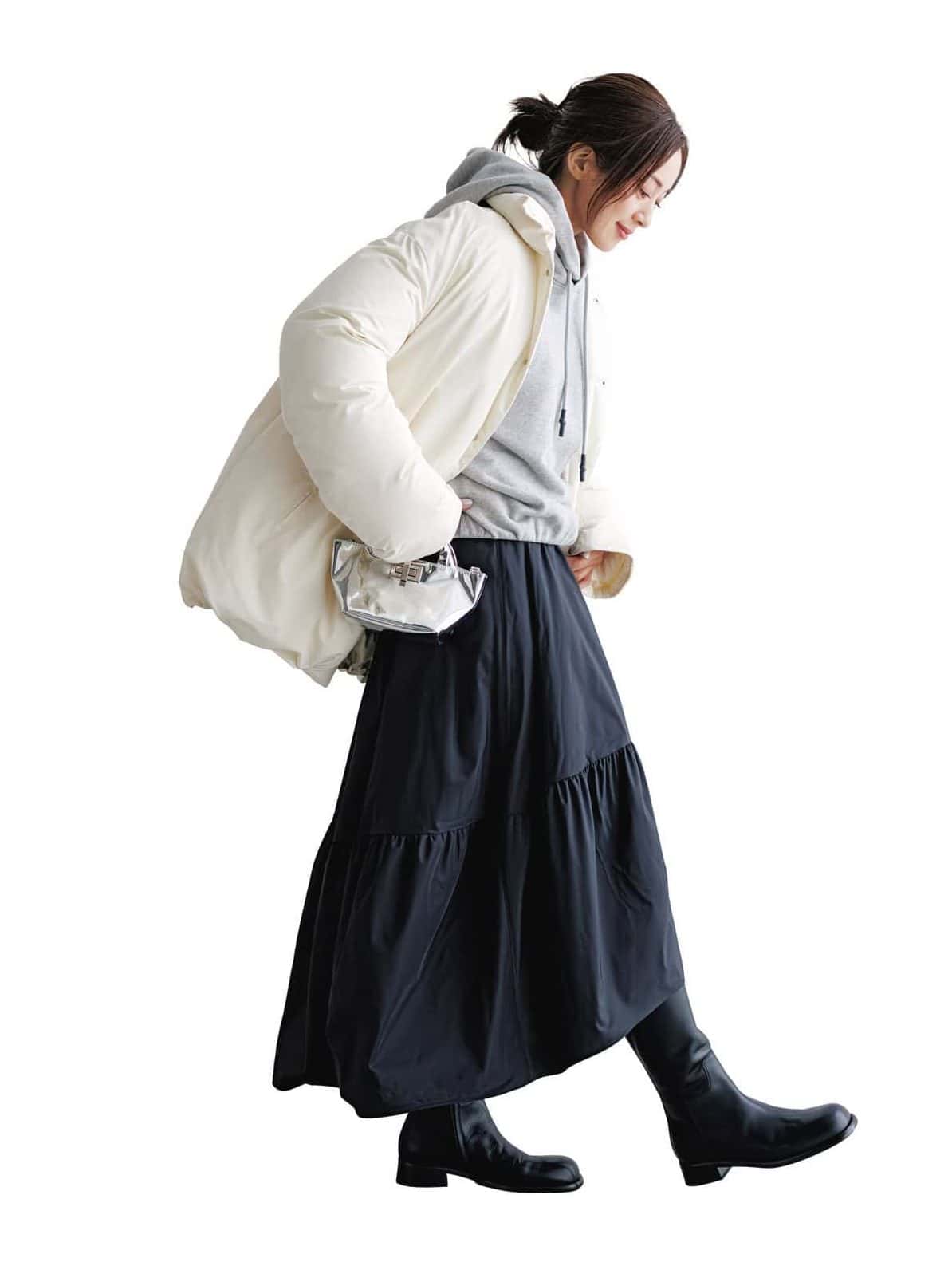 白ダウンの軽やかさに、グレーと黒を効かせた洗練モノトーンコーデ。フードパーカー×ダウンで防寒は万全でも、アシンメトリーの黒スカートが動きを演出します。暖かさとドラマチックさを両立した、大人の余裕が漂う冬スタイルです。
