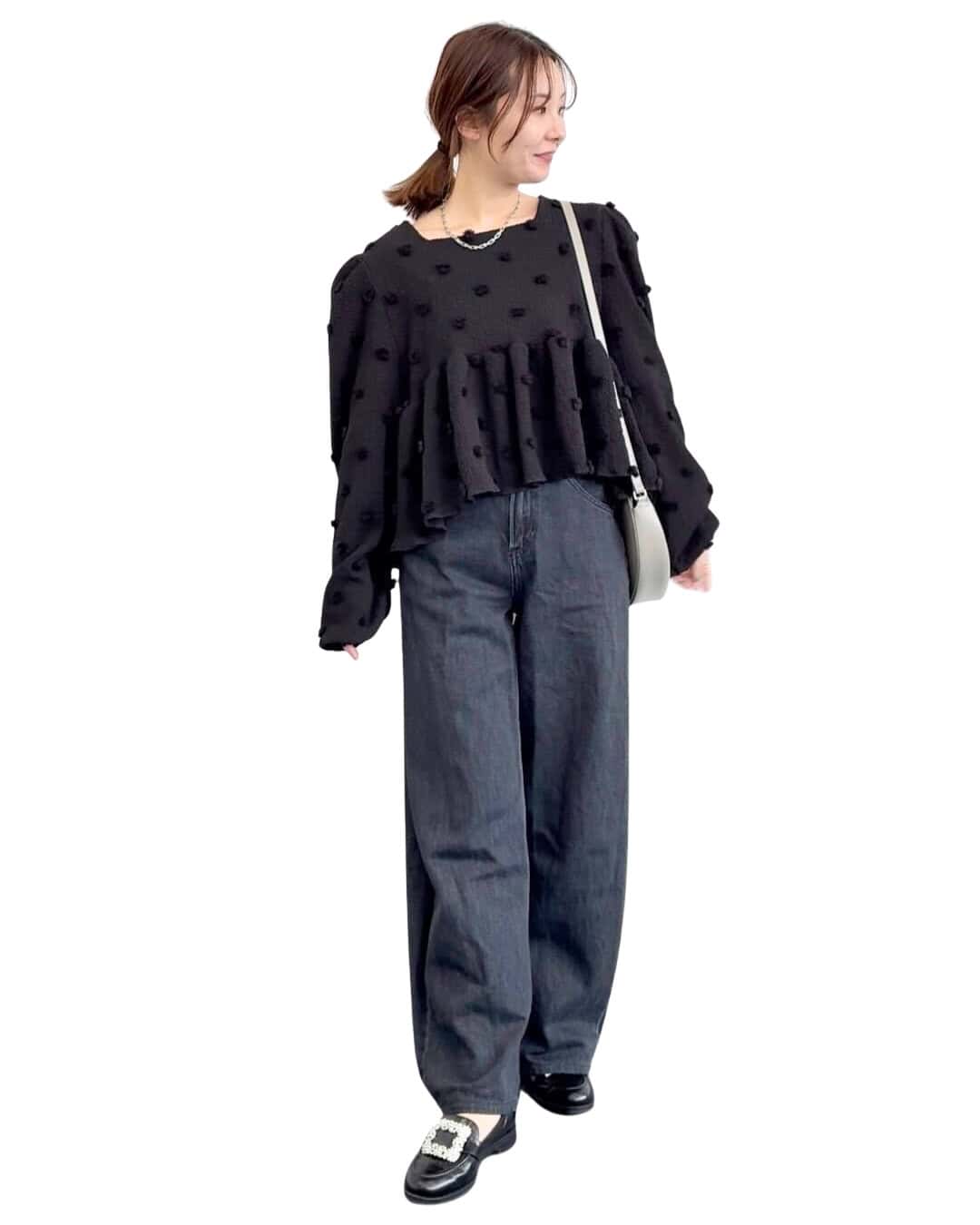③「短丈ブラウス」はハイウエストデニムできれいめカジュアルに
