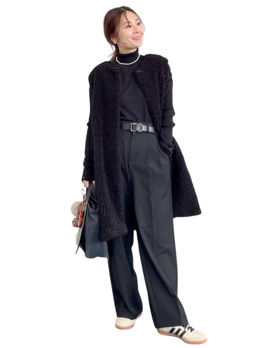 ①「甘タートルニット」をブラックコーデで引き締め!