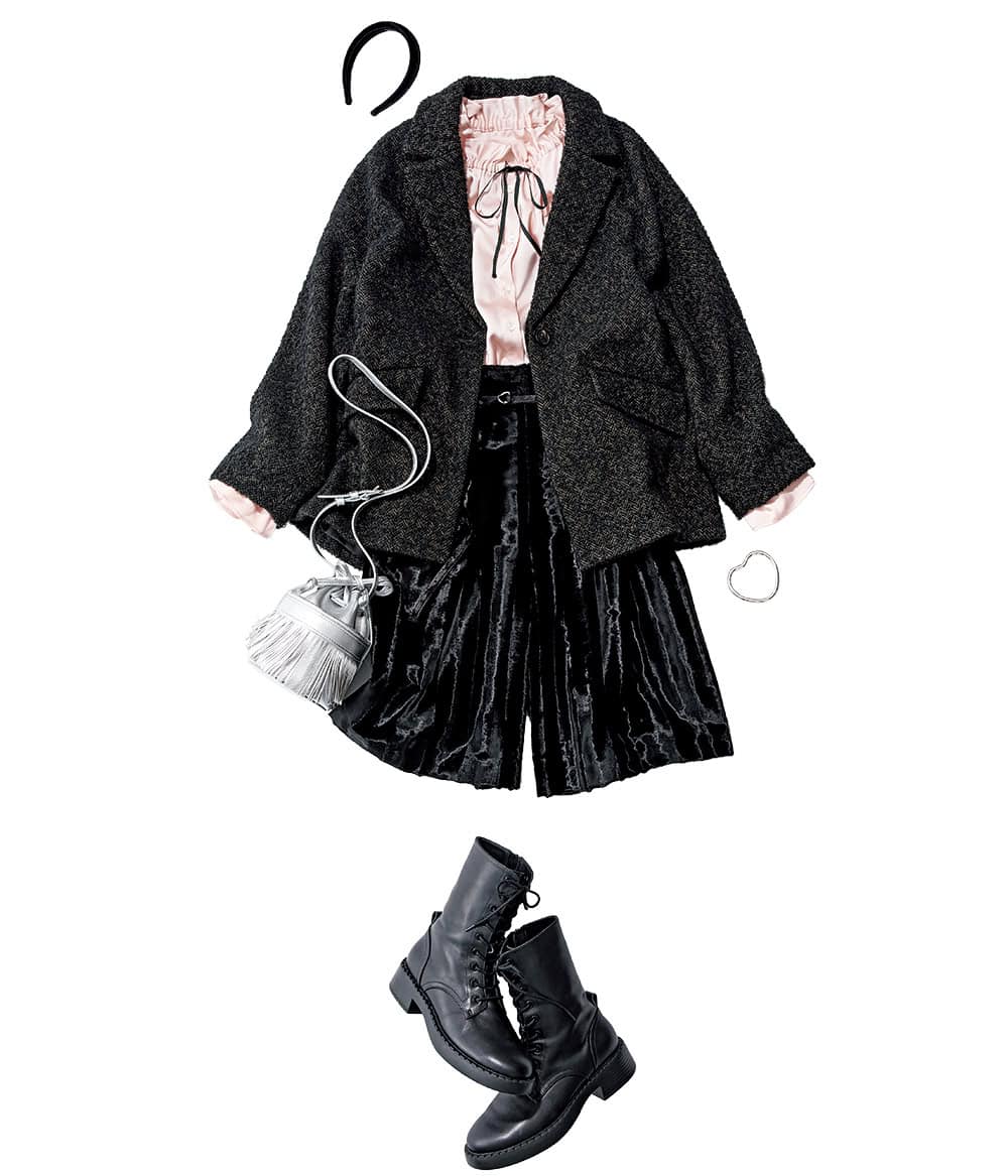 可愛らしさを黒で損なわない〝淡ピンク〟のフリルブラウスにヘリンボーンツイードをON。
