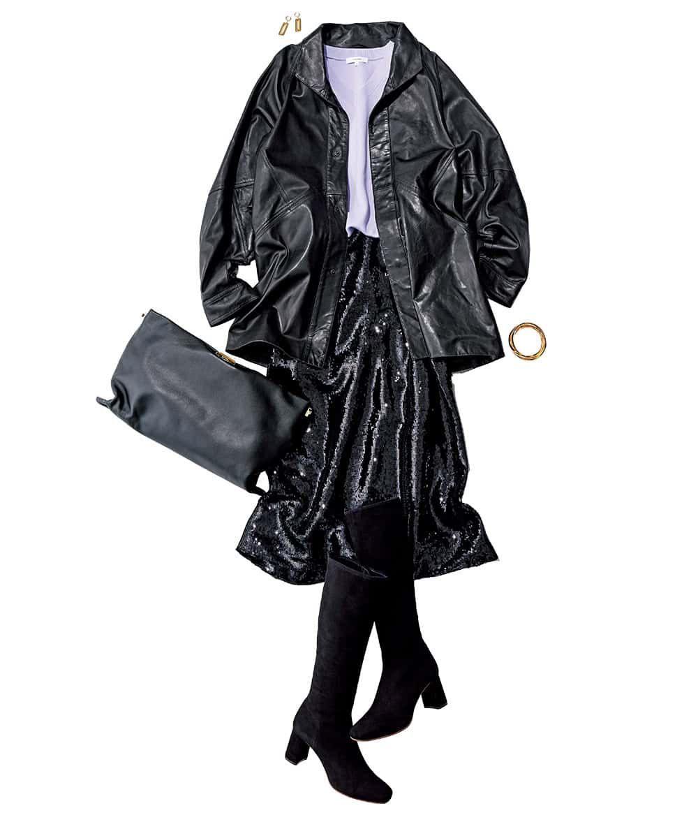 黒の強さに負けない凜々しさを〝パープル〟ニットにレザー合わせで引き立て合うスタイル。バッグやブーツの小物もシャープな黒アイテムにすると大人顔が引き立ちます。
