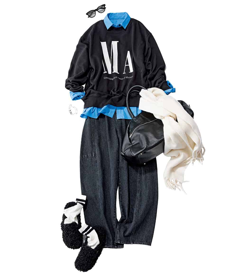 すっきりした顔立ちは〝爽やかブルー〟にロゴスウェットを重ねて 黒を脱地味カジュアルに。