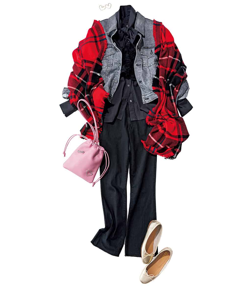 ストール¥45,100(アソース メレ/アイネックス)デニムジャケット¥40,700(ヤヌーク/カイタックインターナショナル)ボウタイブラウス¥19,800(ヴェルソー/ジオン商事)チュールベスト¥26,400(ジェーン スミス/シップス インフォメーションセンター)デニムパンツ¥42,900(マザー/リトルリーグ インク)バッグ※ブローチはカスタマイズ可能¥39,600(ヴァジック/ヴァジックジャパン)バレエシューズ¥35,200(スペルタ/フラッパーズ)ピアス¥38,500(プラウ)