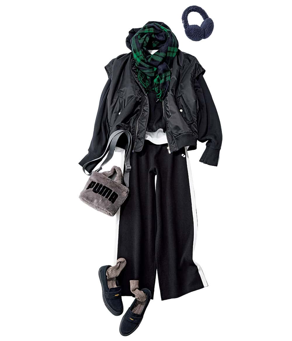マフラー¥52,800(ジョシュアエリス/真下商事)ベスト¥39,600(アッパーハイツ/ゲストリスト)パーカ¥33,990(アストラット/アストラット 新宿店)Tシャツ¥9,900(アルページュストーリーオリジナル)ニットパンツ¥22,000(ルーニィ)バッグ¥6,160(プーマ)ローファースニーカー¥16,500(コンバース/コンバースインフォメーションセンター)イヤマフ¥33,000(ミュールバウアー/H.P.FRANCE)ソックス¥3,300(ブルーフォレ/リトルリーグ インク)