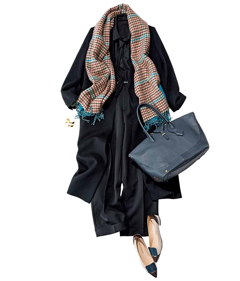 ストール¥3,890(スタディオクリップ/アダストリア)コート¥79,200(エモエレ/アダム エ ロペ)ボウタイ付きシャツ¥19,800(ヴェルソー/ジオン商事)パンツ¥13,200(マルゥ/ユナイテッドアローズ カスタマーサービスデスク)ベルト¥11,000(レフィエ/フラッパーズ)バッグ¥176,000(A.D.M.J./アクセソワドゥマドモワゼル)フラットシューズ¥34,100(ファビオ ルスコーニ/伊勢丹新宿本店 本館2F 婦人靴)バングル¥4,400(アビステ)