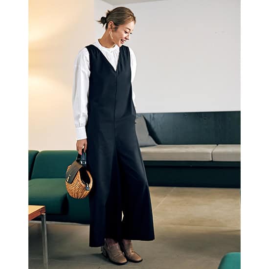 ワイドシルエットのオールインワンは、程よいツヤ感とドレープ感が上品で、一枚あるとイベントシーンからデイリーまで役立つこと間違いなし。華奢なレースアップで後ろ姿にポイントを。また、シワになりにくくツヤのある生地なので、ドレープが美しく出ます。手持ちの甘めトップスを合わせれば、ほんのりマニッシュな印象に。