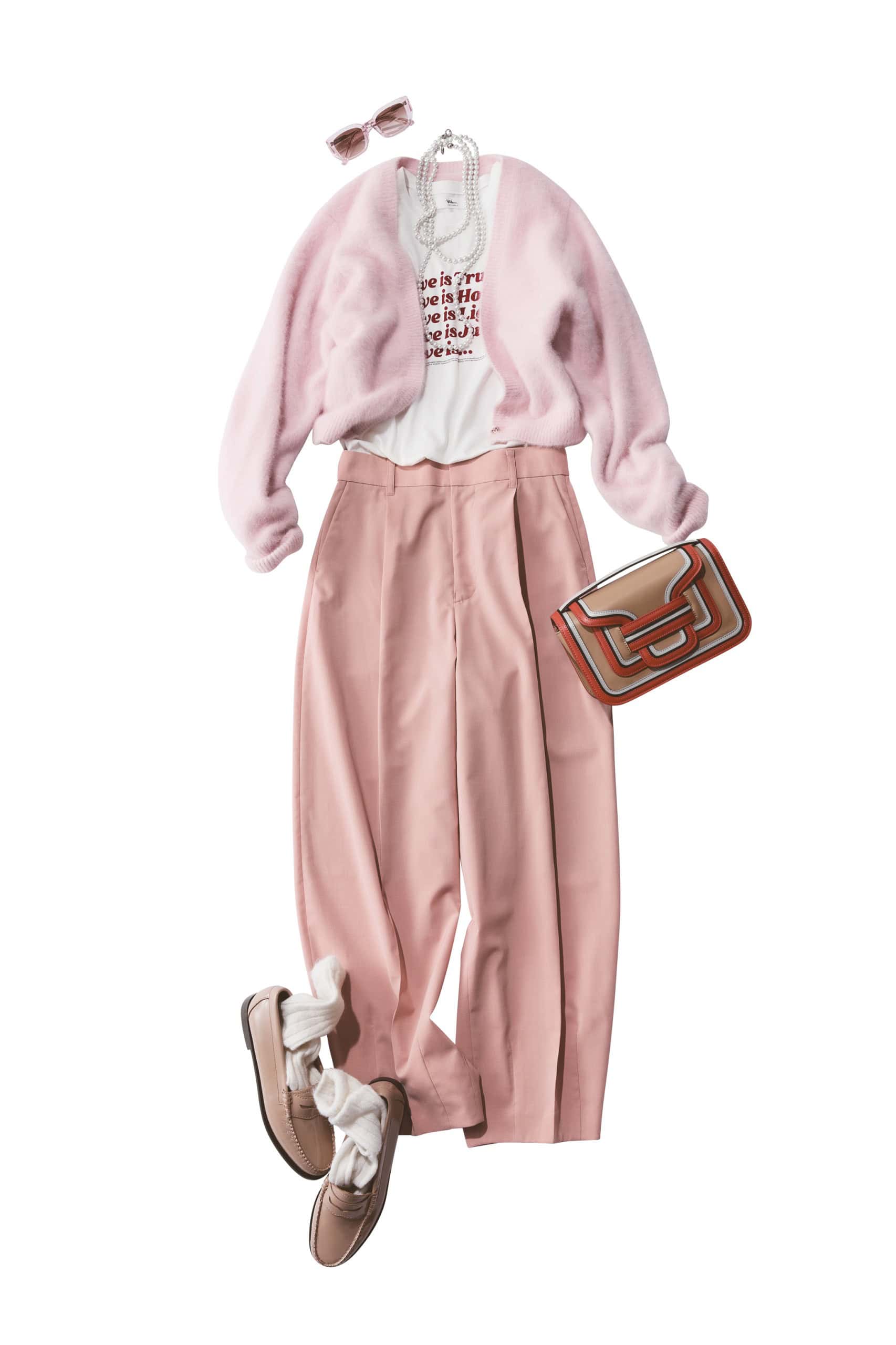 カーディガン¥37,400(ルル・ウィルビー/アルアバイル)Tシャツ¥17,600(ロンハーマン)パンツ¥26,400(マルティニーク/マルティニーク ルミネ横浜)バッグ¥209,000(ピエール アルディ/ピエール アルディ 東京)靴¥34,100(ジーエイチバス/ジーエイチバス トウキョウ)ショートネックレス¥10,800ロングネックレス¥29,700(ともにアビステ)サングラス¥16,500(ランバン オン ブルー/デリーゴジャパン)ソックス¥3,300(ブルーフォレ/リトルリーグ インク)