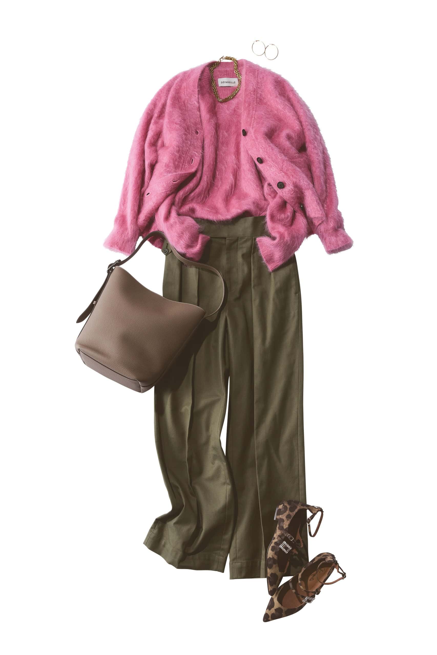 ニット¥88,000カーディガン¥99,000(ともにデパリエ/デパリエ 伊勢丹新宿店)パンツ¥30,800(タンジェント/ザ エディット ストア)バッグ¥238,700(ボナベンチュラ)パンプス¥24,200(銀座かねまつ/銀座かねまつ6丁目本店)ピアス各¥198,000(マユオカマツ/マユ ショールーム)ネックレス¥25,300(メラキ/オブリオ)