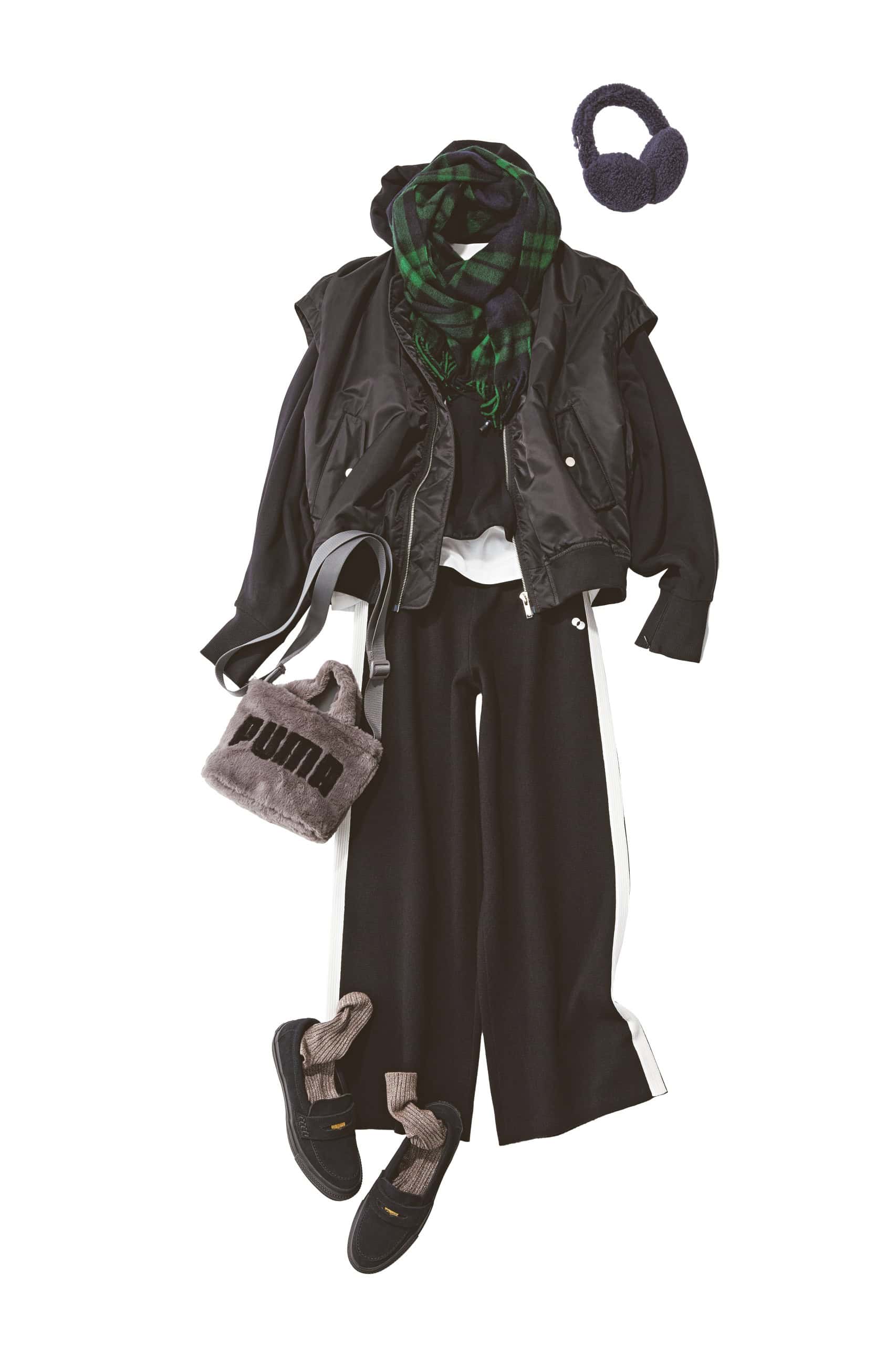 マフラー¥52,800(ジョシュアエリス/真下商事)ベスト¥39,600(アッパーハイツ/ゲストリスト)パーカ¥33,990(アストラット/アストラット 新宿店)Tシャツ¥9,900(アルページュストーリーオリジナル)ニットパンツ¥22,000(ルーニィ)バッグ¥6,160(プーマ)ローファースニーカー¥16,500(コンバース/コンバースインフォメーションセンター)イヤマフ¥33,000(ミュールバウアー/H.P.FRANCE)ソックス¥3,300(ブルーフォレ/リトルリーグ インク)