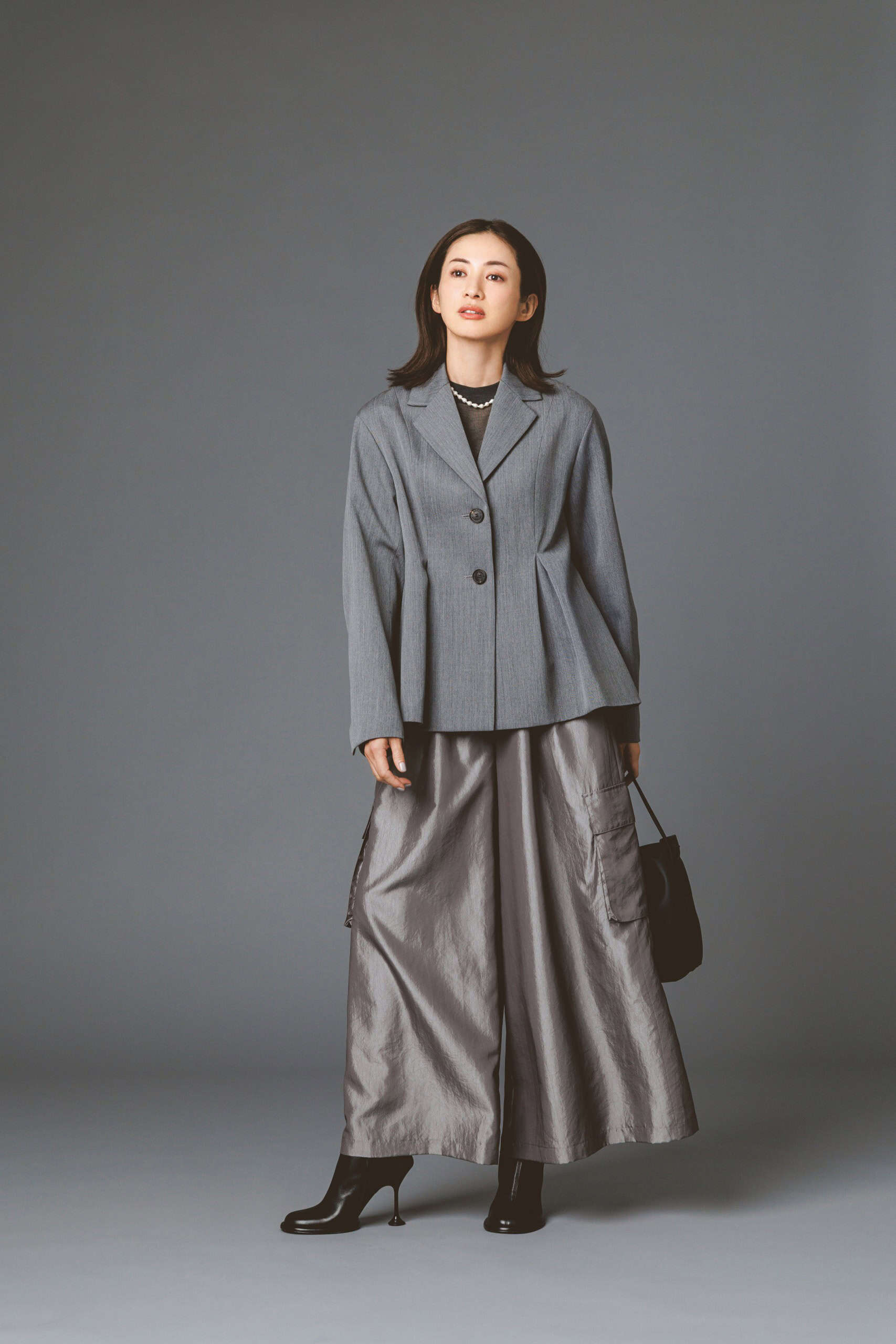 スカートのように広がるカーゴワイドはキレイめ派にもハマる一本。ボディラインを拾わず、脚長効果も秀逸。光沢素材がカジュアル感を中和し、ジャケット&ヒール合わせでぐっとエレガントに着地します。グレーのワントーンと異素材ミックスが立体感を出し、凛とした華やかさも演出。シーンレスに活躍する主役級パンツです。