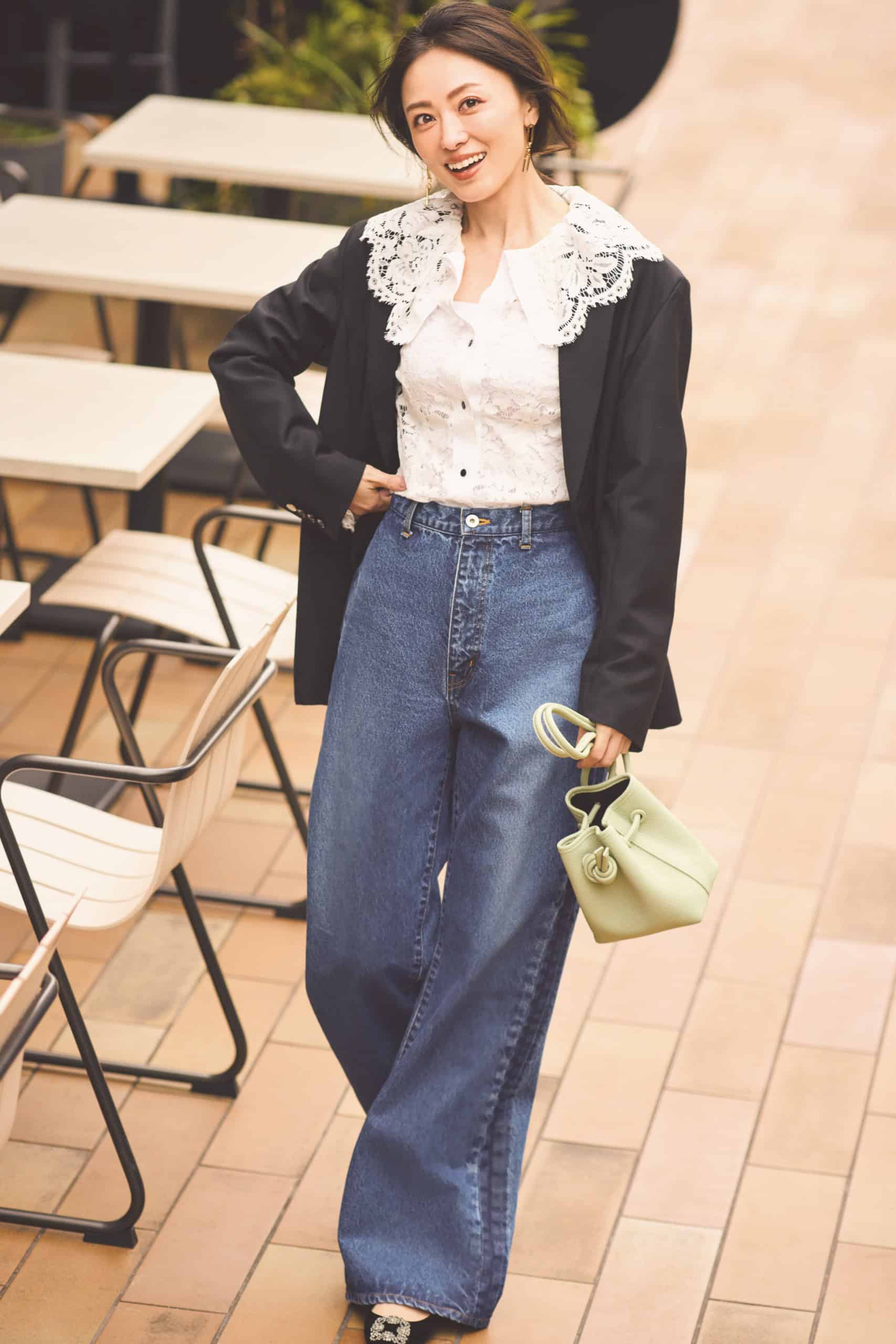 甘ディテールが華やかなレースブラウス、黒ジャケットを重ねて気負わない休日仕様に。太め&長めでもダボっと見えしない洗練シルエットのデニムが、甘さをほどよく引き算。力を抜いた着こなしの中に品のよさがにじむ、気分まで上向く甘カジュアルが完成します。