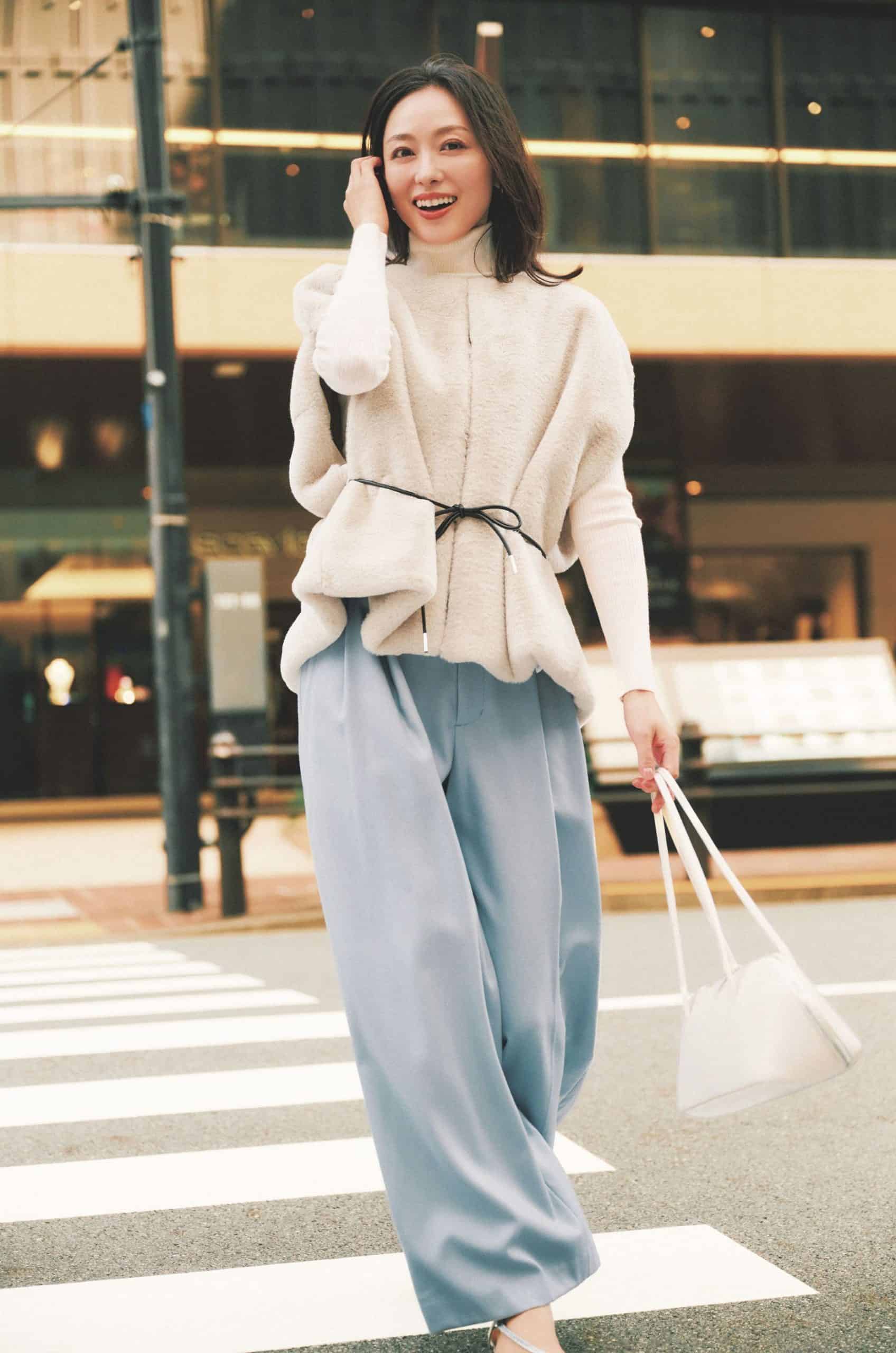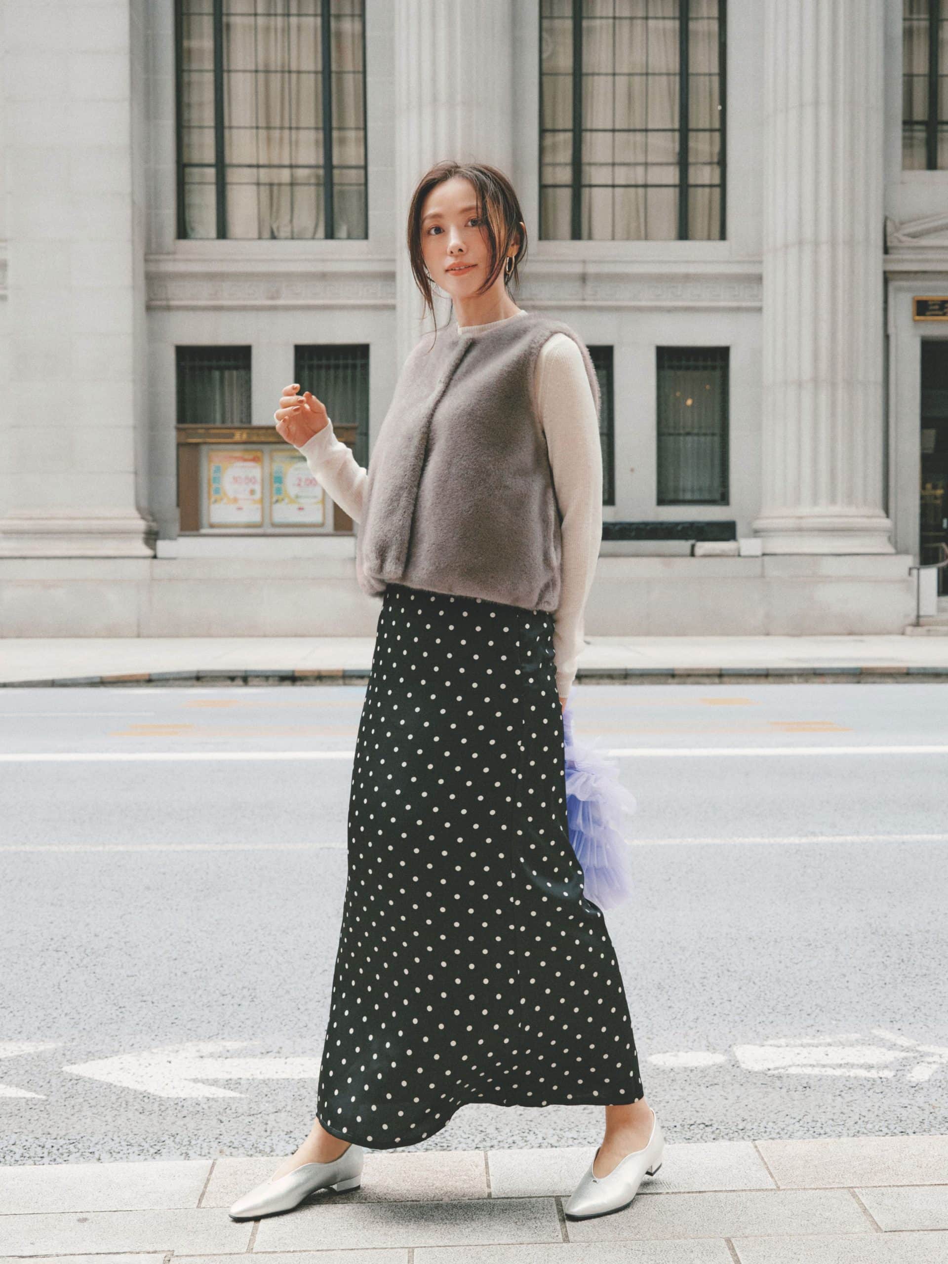 シンプルな色味のトップスにドットが華やかさを取り入れます。柔らかいとろみ素材なので、キャッチーな柄も浮かず、悪目立ちしないのがポイント。直線的なシルエットは、膨張しがちなボアベストをシャープにまとめてくれます。