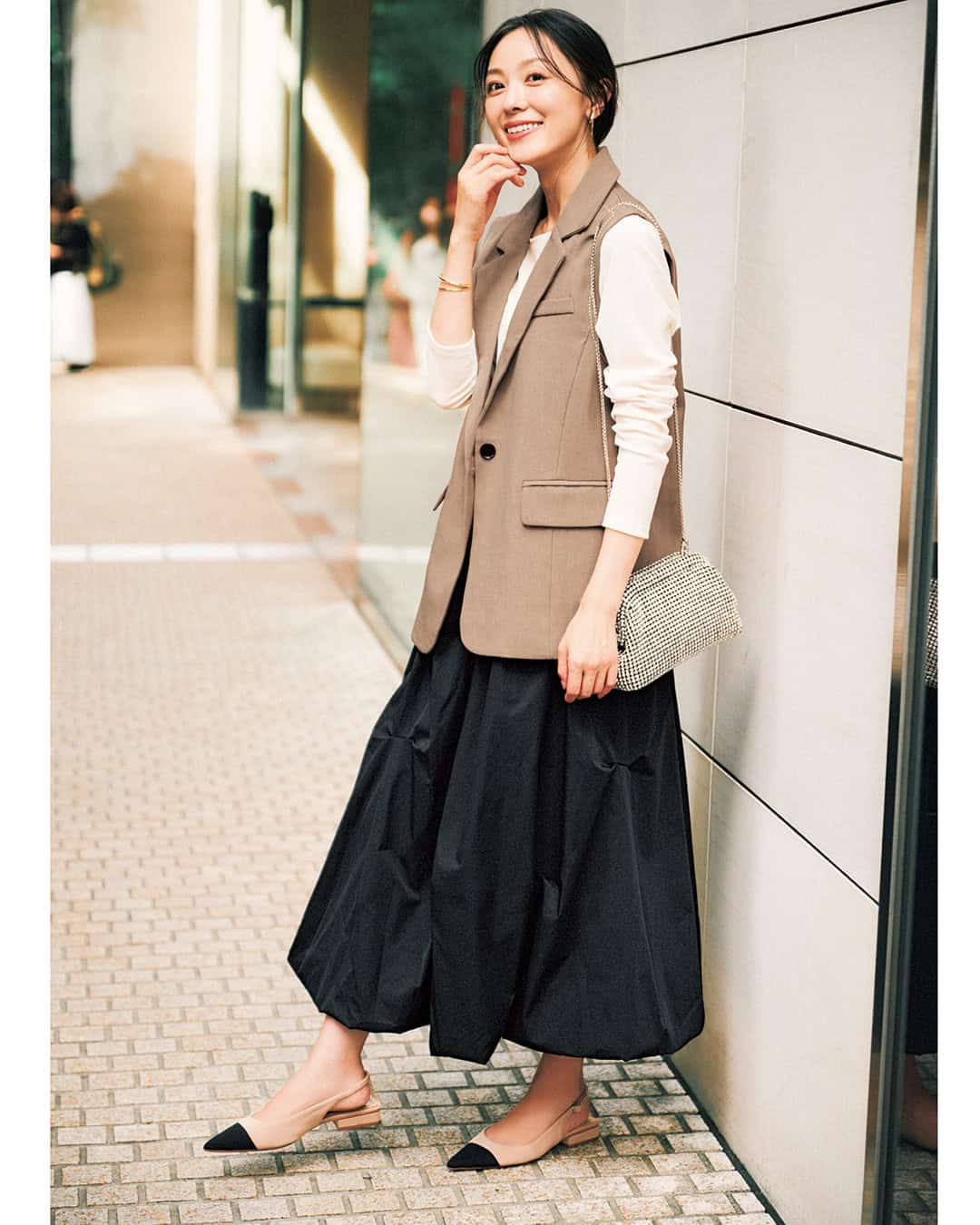 ジレ¥5,980スカート¥5,980(ともにベベッド)カットソー¥11,000(カデュネ/カデュネ プレスルーム)バッグ¥14,300(アルテミス by ダイアナ/アルテミス by ダイアナ アーバンドック ららぽーと豊洲店)シューズ¥26,400(ツル バイマリコ オイカワ)ピアス¥38,500(プラウ)ブレスレット¥19,800(ワンエーアールバイウノアエレ/ウノアエレ ジャパン)