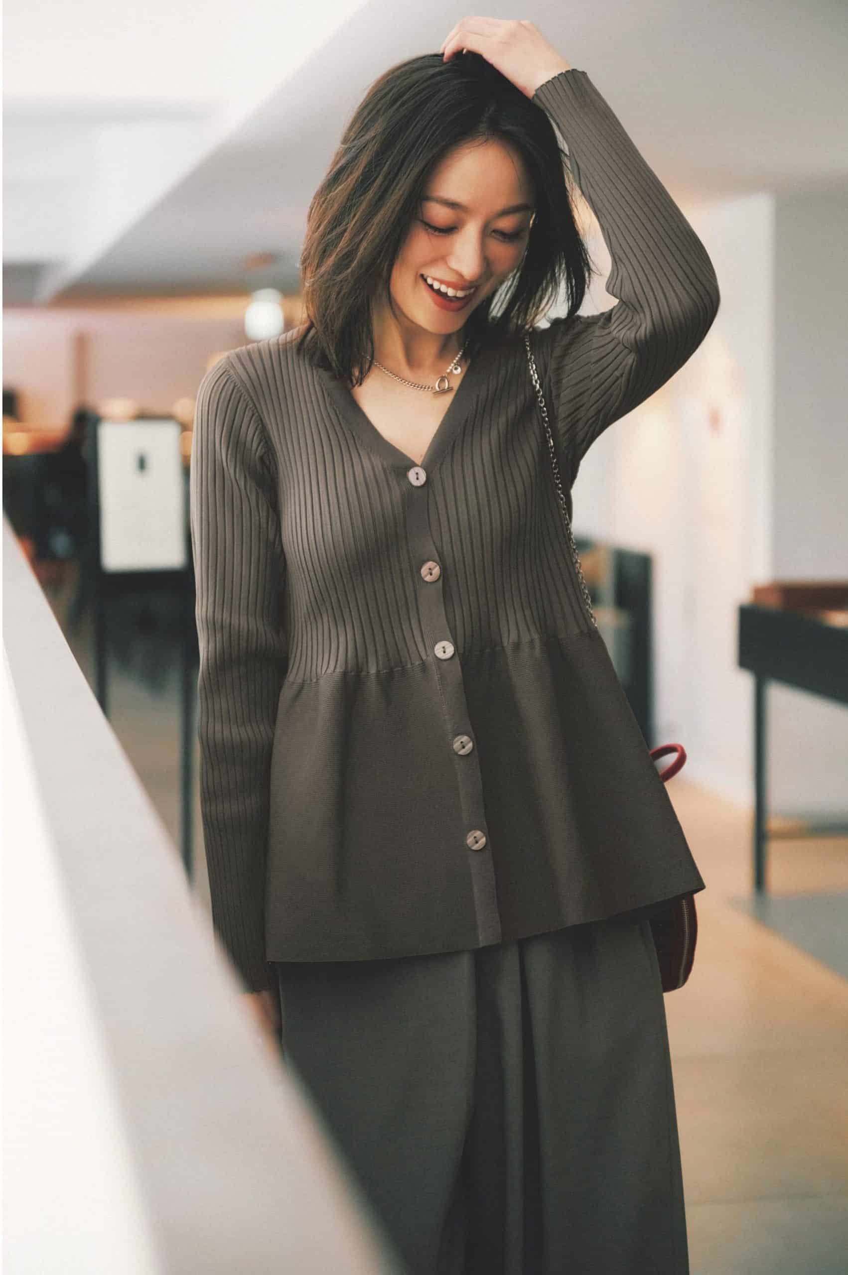 お悩み多き下半身をふわっと包み込む優秀さから大人気のペプラム。立体感を持ちながらも、上半身は適度にフィットしたリブ素材でより女性らしいビジュアルに。フェミニンなアイテムは、シックなくすみ色で引き算をするのが最適です。