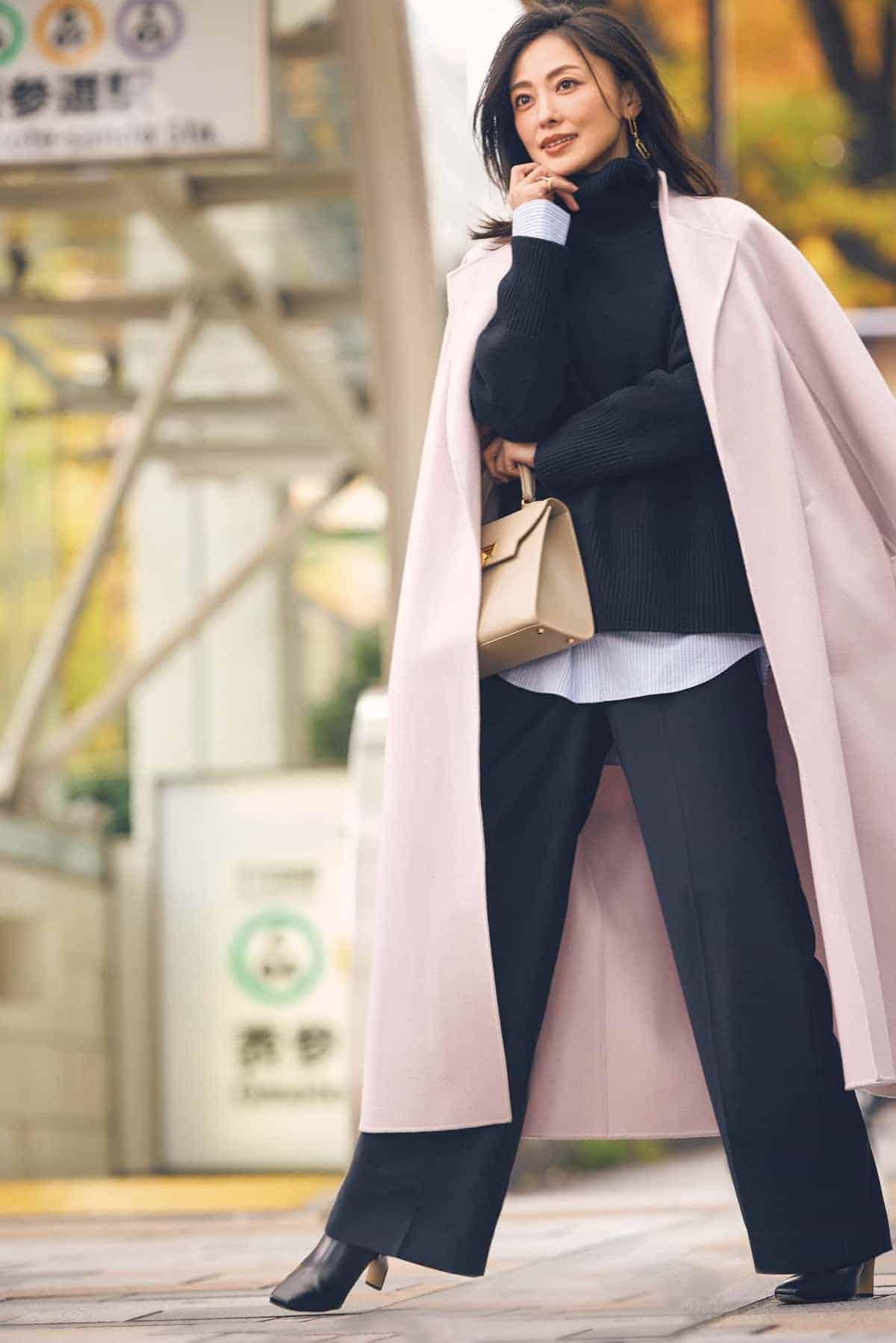 スラックス¥ 55,000(THE THIRD Mザ サードマガジンAGAZINE)コート¥110,000(カオス/カオス丸の内)ニット¥33,000(プルミエ アロンディスモン/プルミエ アロンディスモン NEWoMan新宿店)シャツ¥25,300(プランクプロジェクト/プランクプロジェクト 青山店)バッグ¥80,300(CARBOTTI/アナイ)ブーツ¥29,150(ダイアナ/ダイアナ 銀座本店)
