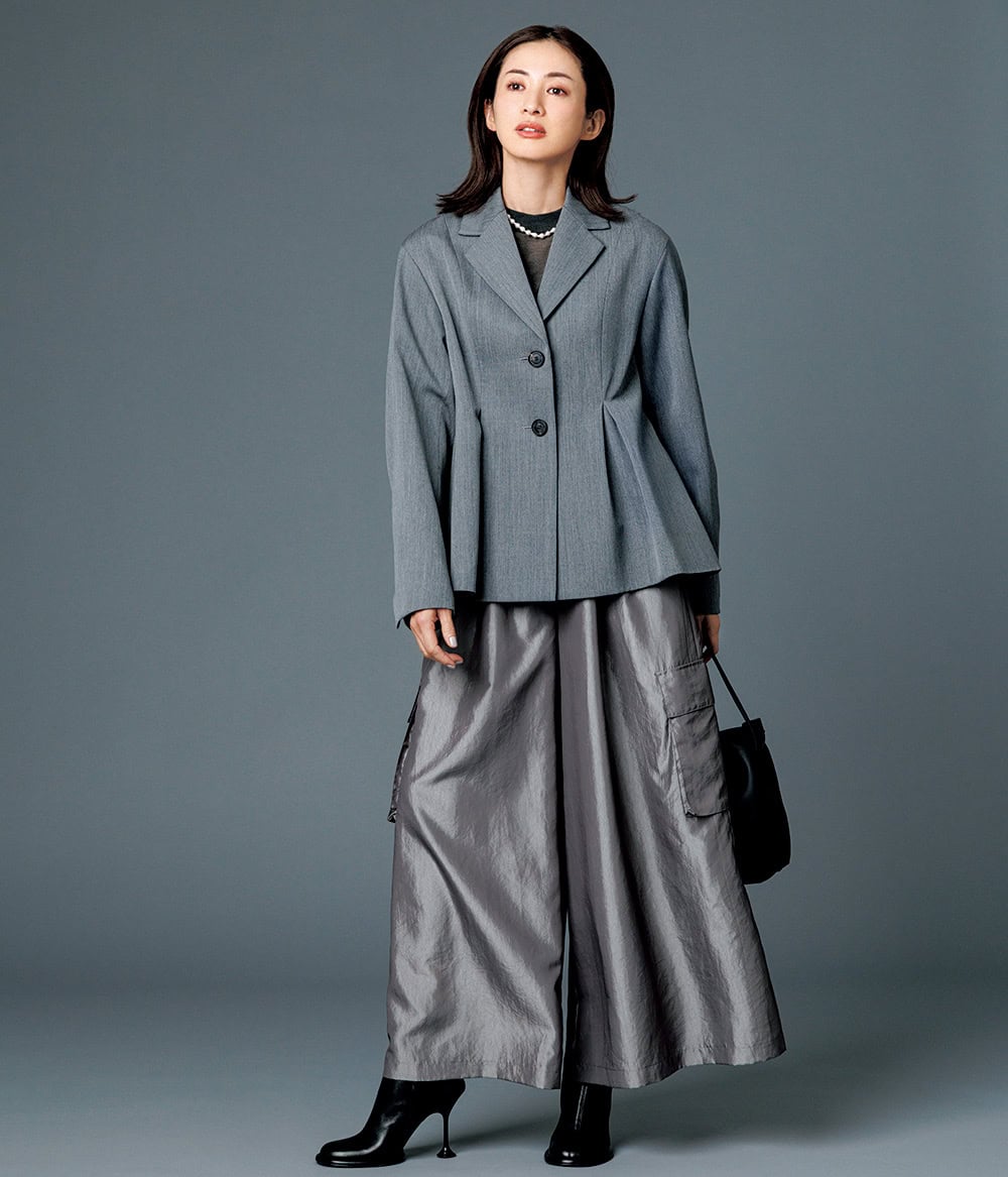 ヒップ周りを包むタックパンツは気になる下腹をカバー。ワイドパンツでも膝下は太すぎず、下半身が重くなる心配もなし。コンパクトなトップスで脚長効果も発揮。ヒールも合いますが、あえてフラットやスニーカーで足元を重くすると旬な印象に。