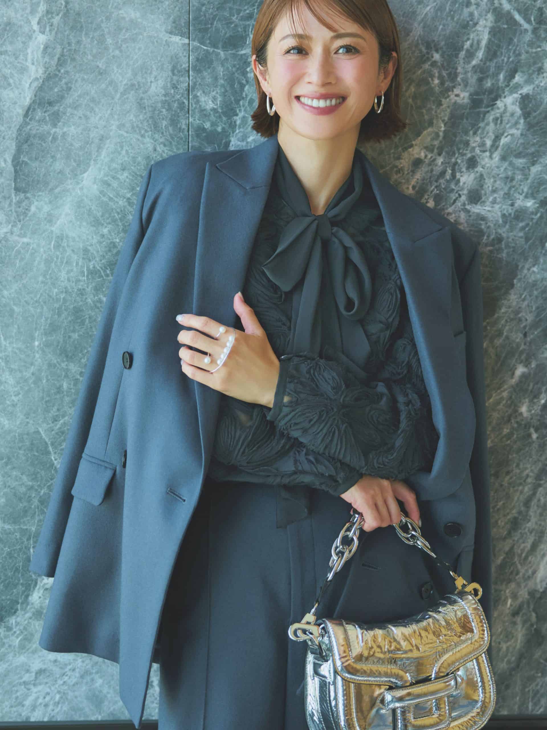 ブラウス¥49,940〈23区 GOLD LABEL〉ジャケット¥44,000パンツ¥27,500〈ともにアンクレイヴ〉(すべてオンワード樫山 お客様相談室)バッグ¥220,000(ピエール アルディ/ピエール アルディ 東京)ピアス¥35,200(マリハ)リング¥59,400(カラットアー/イセタンサローネ 東京)