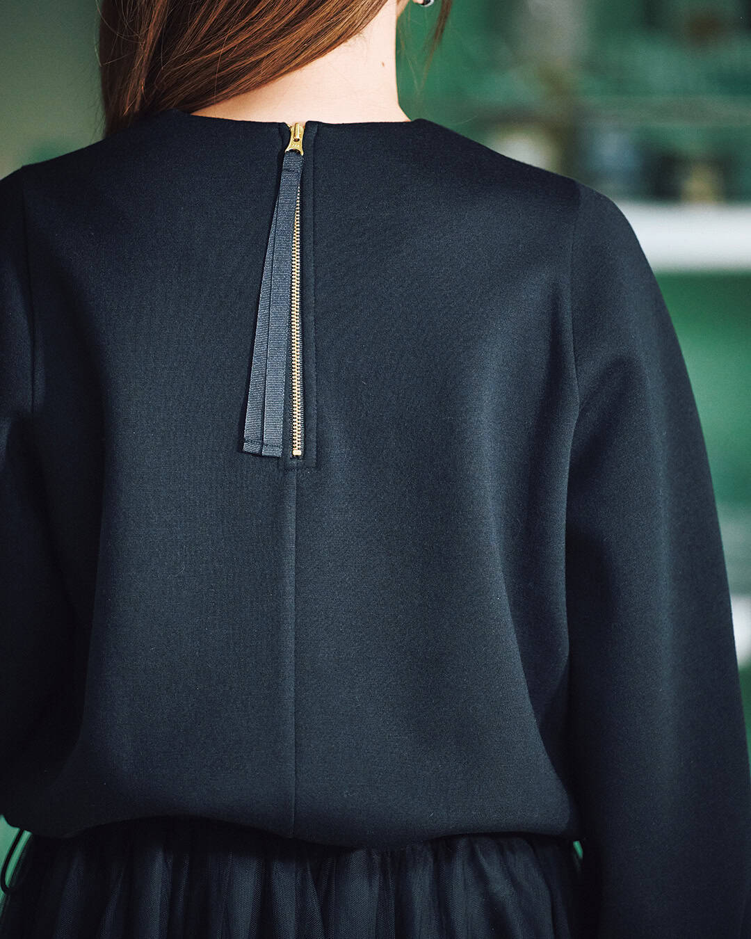 スカートとトップスをコーディネートしたように見えるワンピは、トップスにジャージーでありながらも表面感がキレイなポンチ素材、スカートにはシアーチュールを贅沢にたっぷりと使いました。後ろは開け閉めをしやすくするためのリボンやゴールドのファスナーがロマンティックムードにも一役買っています。ウエストはスピンドルゴム仕様で、調節が可能です。もちろん自宅でのお手入れが可能です。