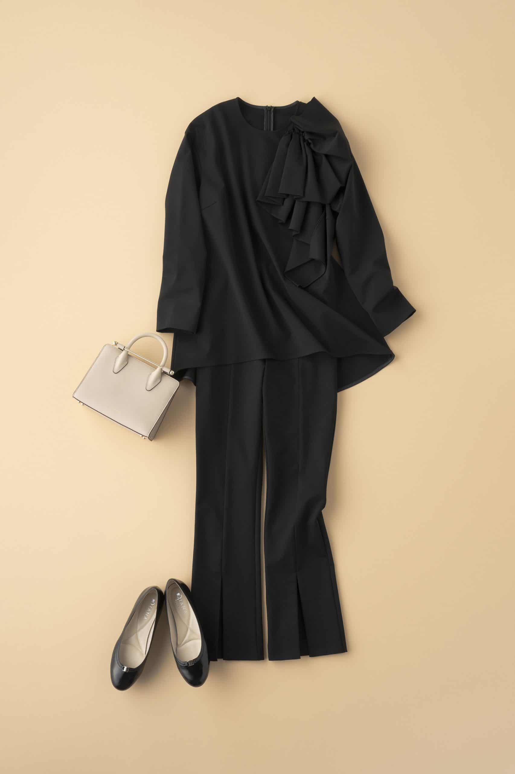 セレモニーシーンには、迷わず同素材のトップスを合わせてセットアップで着こなしたい。上下揃えるだけで“きちんと感”と“品の良さ”も纏えるのが嬉しいポイント。大胆にあしらわれたリボンのようなドレープは、アクセサリー要らずで顔まわりを華やかに見せてくれる主役級ディテール。シンプルな中にモードな雰囲気も漂う大人だからこそ似合う一着です。スリットパンツが程よい抜け感を足して、オールブラックでも重くなりすぎず、セレモニーにふさわしい大人の余裕あるコーデに仕上がります。