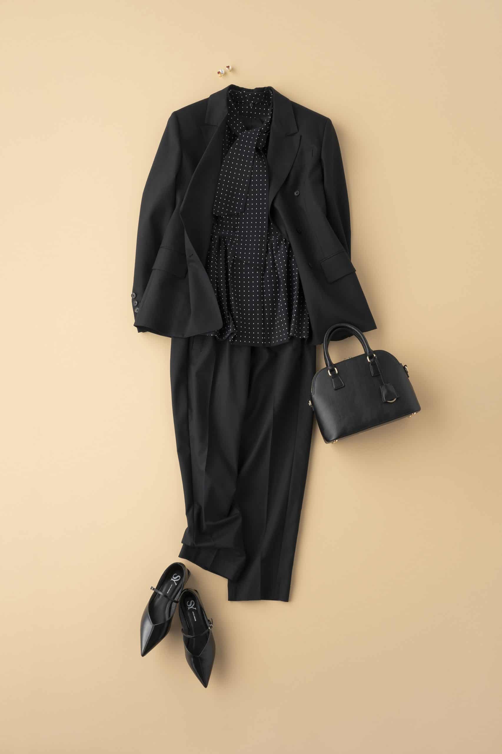 セレモニーシーンは王道ネイビーが多いなか、ブラックのセットアップを選ぶだけでぐっと洗練された印象に。きちんと感はそのままに、より引き締まって見えるから、甘さを抑えた大人のセレモニーコーデに仕上がります。主役になるボウタイジレブラウスは、コーデに立体感を出しつつ顔まわりは華やかに。オールブラックの端正さに、ペプラムや小さなピンドットを効かせて甘ニッシュにまとめれば、定番スーツスタイルも今っぽく更新できます。