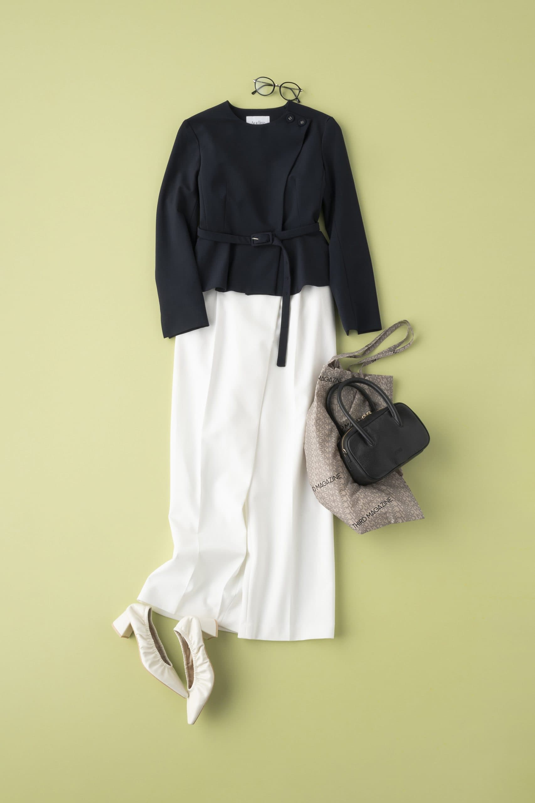 ペプラムジャケット¥38,500(アウディーレ)パンツ¥12,000パンプス¥11,000(ともにプラステ)バッグ¥37,400(モフィオラ/アマン)トートバッグ¥4,180(サードマガジン)メガネ¥1,290(GU)