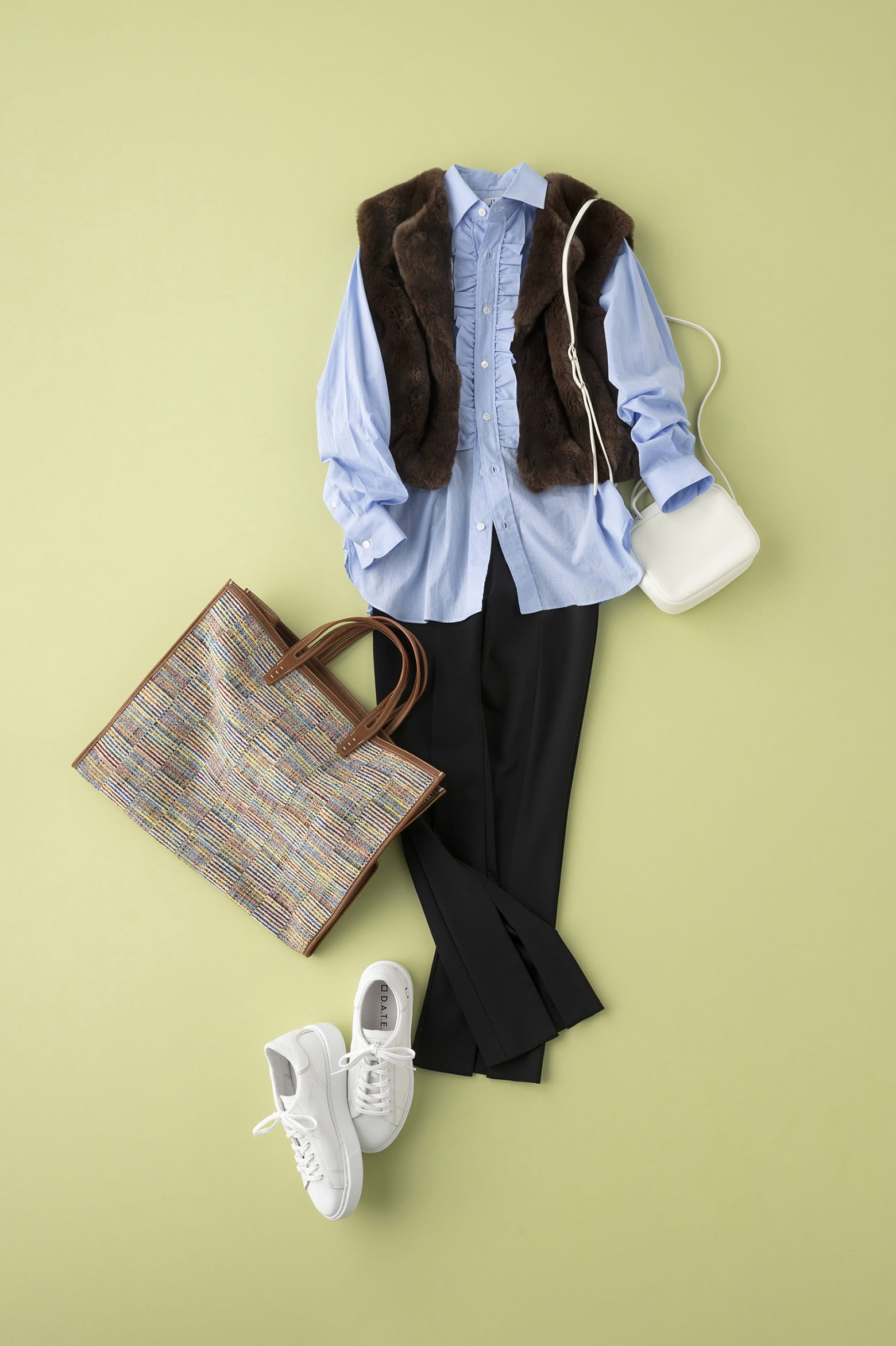 パンツ¥22,000(ルフィル/LE PHIL NEWoMan新宿店)ベスト¥121,000(コルコバード/フィルム)ブラウス¥62,700(セブリン/アマン)バッグ¥44,000(アエタ/スーパー エー マーケット 青山)トートバック¥73,700(ア ヴァケーション/ノーベルバ)スニーカー¥37,400(デイト/ティースクエア プレスルーム)