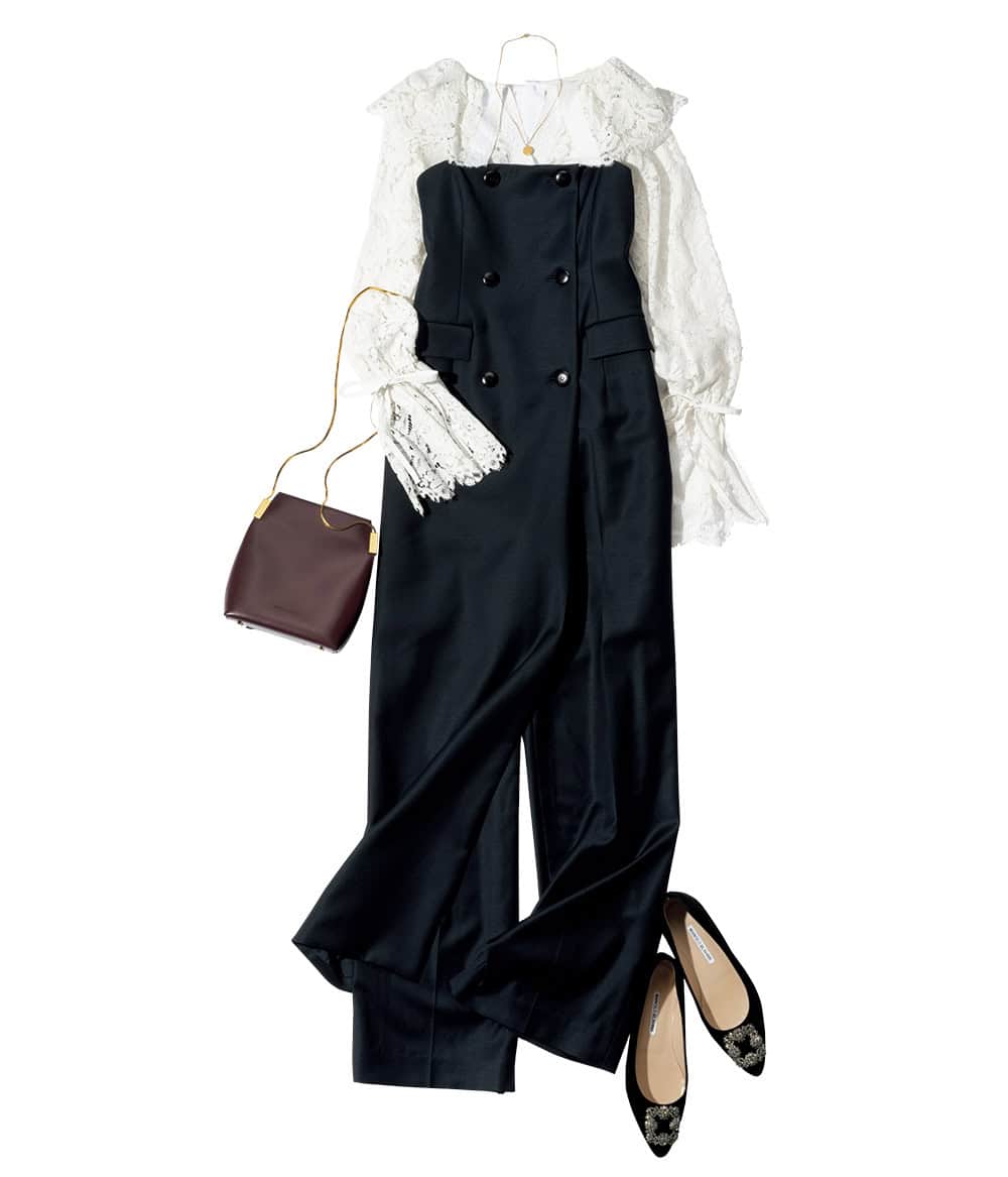 MANOLO BLAHNIKのパンプス¥215,600 PRANKPROJECTのレースブラウス¥22,000 MARIHAのネックレス ¥56,100 オールインワン¥99,000(ザ サードマガジン/サードマガジン)バッグ¥69,300(マエストソ/オブリオ)