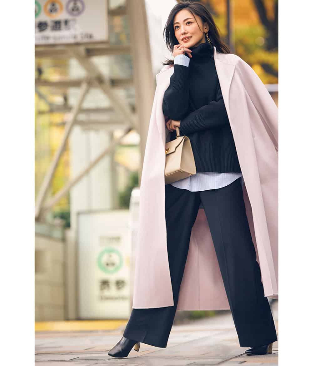 Rieukのリング ¥40,700 BLANCIRISのピアス ¥52,800 ”THE” THIRD MAGAZINEのスラックス ¥55,000 コート¥110,000(カオス/カオス丸の内)ニット¥33,000(プルミエ アロンディスモン/プルミエ アロンディスモン NEWoMan新宿店)シャツ¥25,300(プランクプロジェクト/プランクプロジェクト 青山店)バッグ¥80,300(CARBOTTI/アナイ)ブーツ¥29,150(ダイアナ/ダイアナ 銀座本店)