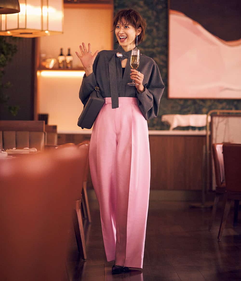 【コーデすべて】ブラウス¥74,800(ハルノブムラタ/ザ・ウォール ショールーム)パンツ¥79,200(アドーア)バッグ¥146,300(J&M デヴィッドソン/J&M デヴィッドソン カスタマーセンター)パンプス¥42,900(ヒューン/クルーズ ショールーム)ピアス¥42,900(マリハ)リング[右手・予定価格]¥49,500リング[左手中指・予定価格]¥148,500リング[左手小指・予定価格]¥70,400(すべてヴァガス/イセタンサローネ東京)