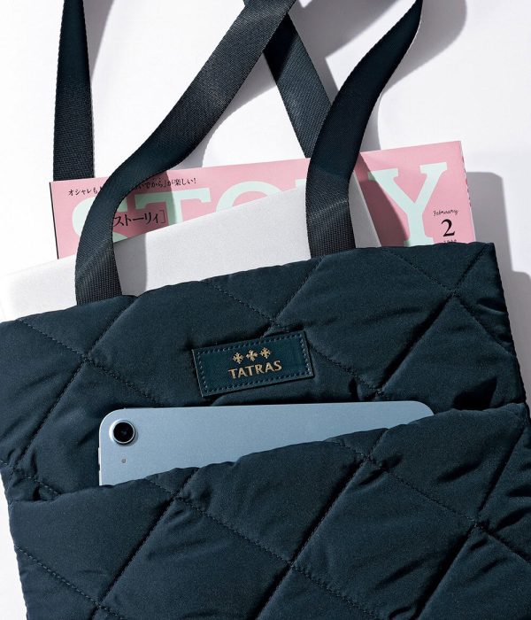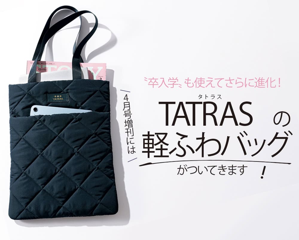 昨年、一昨年に実施し発売と同時に大きな反響があったタトラスの〝軽ふわトートバッグ〟付録。今年は上品なネイビーに進化しました。仕事だけでなくセレモニーでも浮かない万能なネイビーはどんな時も頼れて万能です。久々の社会復帰や新しいクラスでのママ友づくりなど様々なデビューが待っている春。40代のリスタートをこのバッグで少しでもポジティブに後押しできればと思います。
