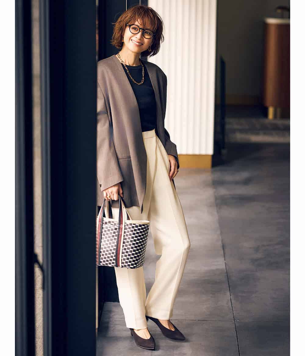 ジャケット¥63,800(プルミエ アロンディスモン/プルミエ アロンディスモン NEWoMan新宿店)ニット¥11,000(ハイク/ボウルズ)パンツ¥46,200(サヴィル サヴィ)バッグ¥207,900(ピエール アルディ/ピエール アルディ 東京)パンプス¥26,400(銀座かねまつ/銀座かねまつ6丁目本店)ピアス¥3,850(ヘンカ/ロードス)メガネ¥40,700(プロポ/プロポデザイン)ネックレス¥165,000(ブランイリス/ブランイリス トーキョー)リング[右手]¥68,200リング[左手]¥35,200(ともにマリハ)