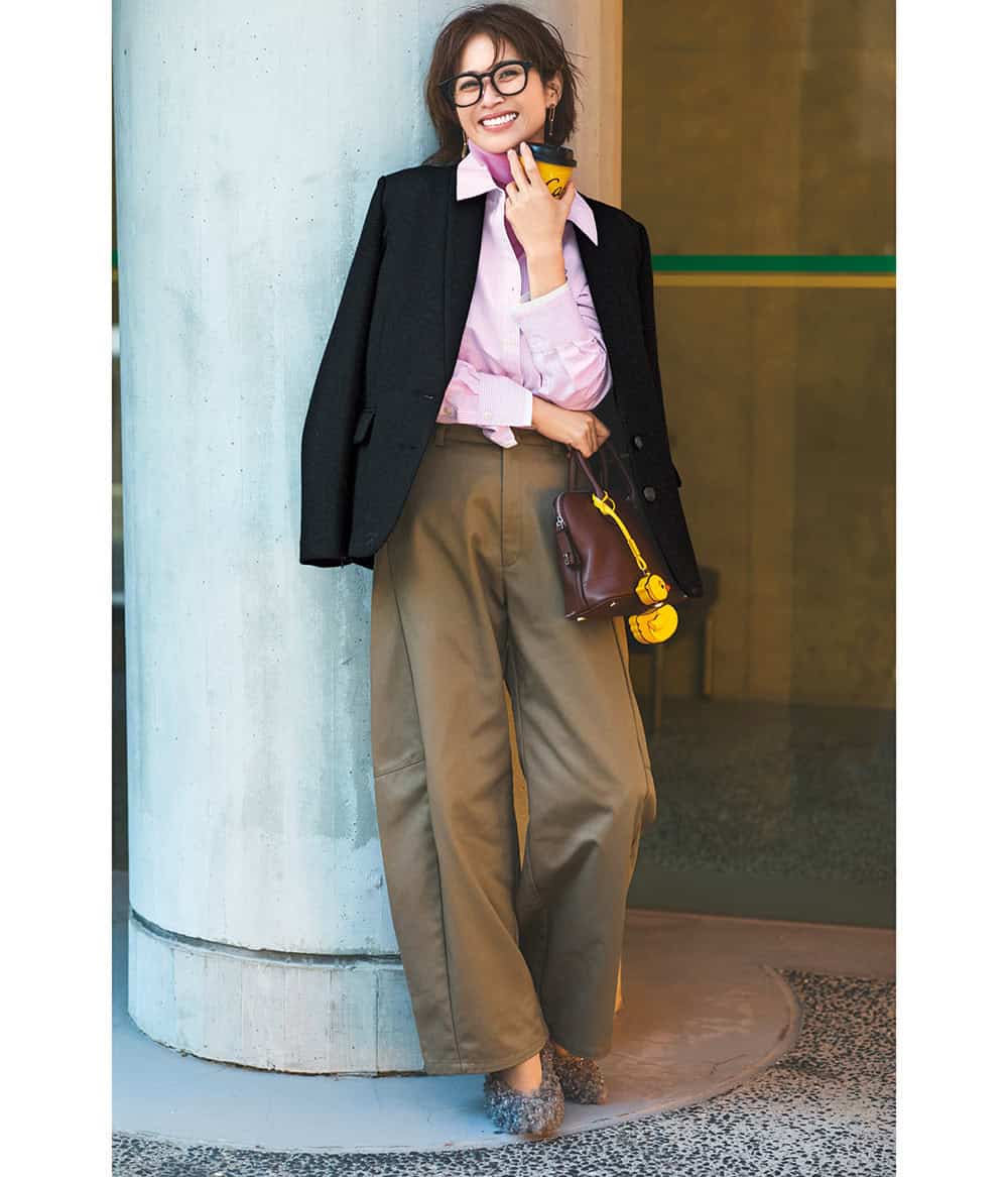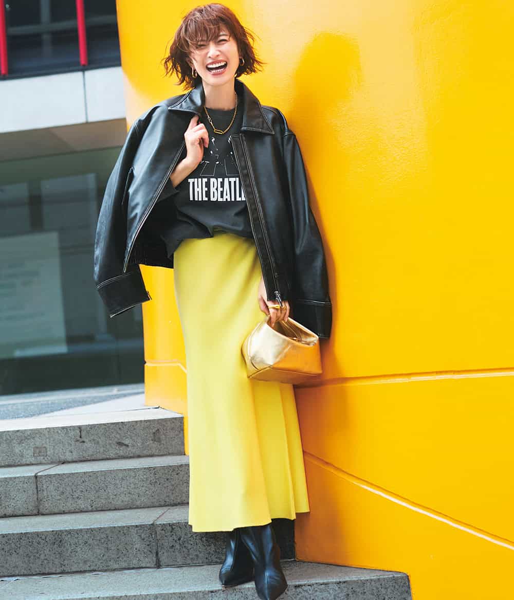 ジャケット¥39,600(メゾンスペシャル/メゾンスペシャル 青山店)Tシャツ¥6,380(GOOD ROCK SPEED/グッドスピード)スカート¥28,600(アルアバイル)バッグ¥70,400(ロンシャン/ロンシャン・ジャパン)ブーツ¥49,500(ペリーコ サニー/アマン)ピアス¥37,400ネックレス¥71,500(ともにブランイリス/ブランイリス トーキョー)リング[人さし指]¥15,400〈エムシー・スタジオ〉リング[薬指]¥10,340〈フル・オブ・グレイス〉(ともにズットホリック)