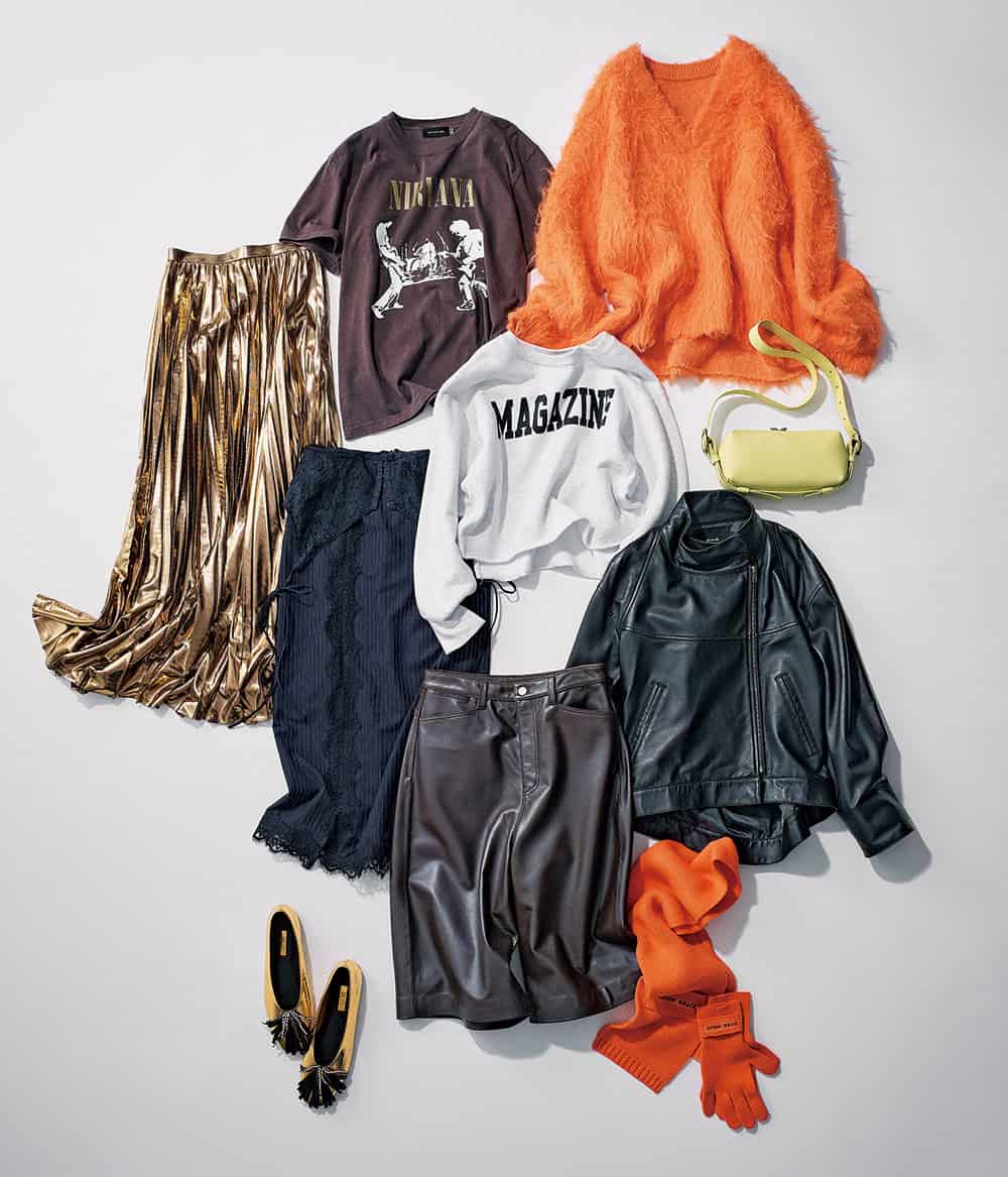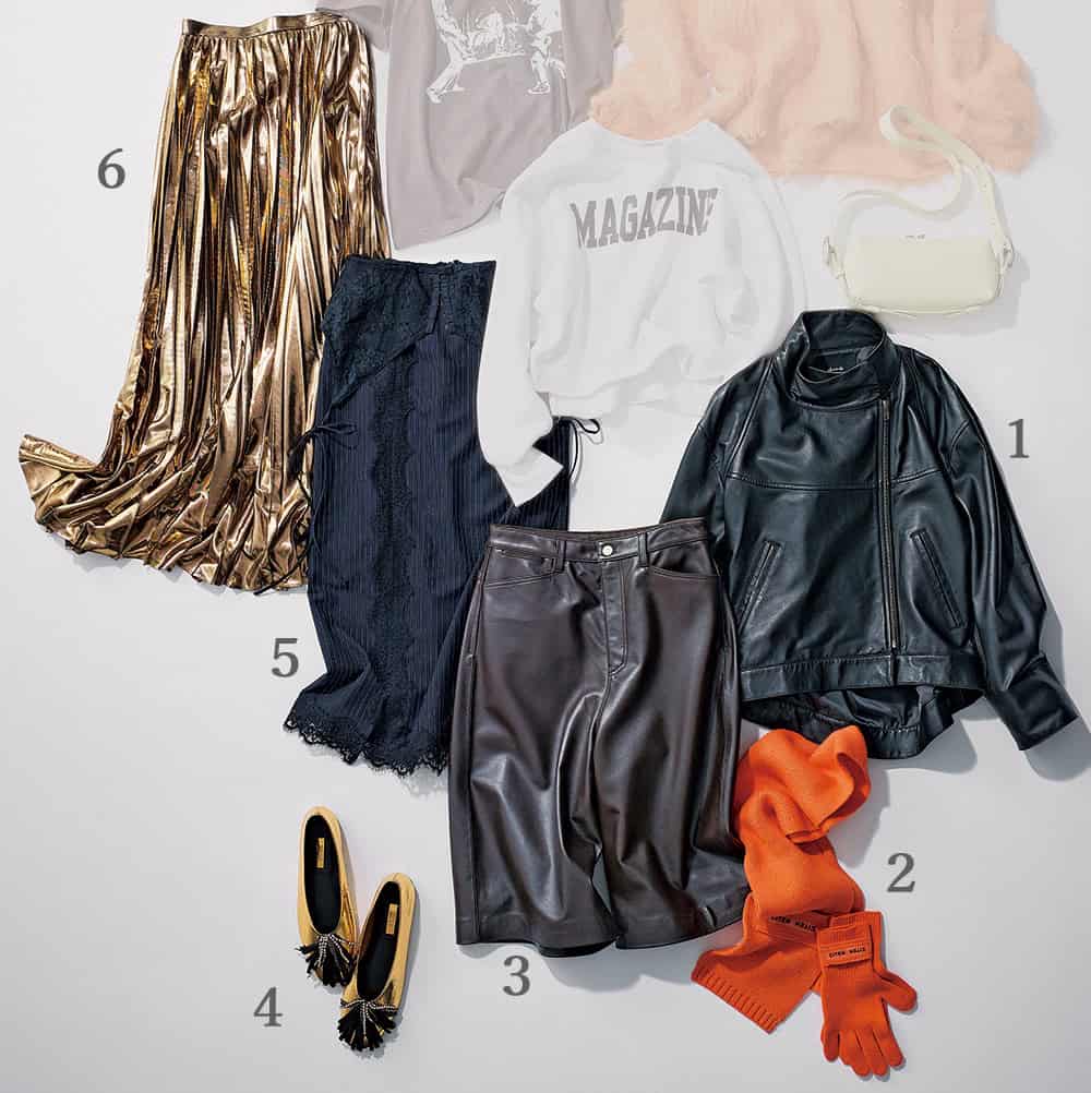 ①レザーブルゾン¥96,800(アルアバイル)②マフラー¥3,520手袋¥2,970(ともにCITEN/ユナイテッドアローズ カスタマーサービスデスク)③ハーフパンツ¥53,900(styling/)④シューズ¥22,000(ル タロン グリーズ/ル タロン グリーズ ルミネ新宿店)⑤スカート¥27,500(プランクプロジェクト/プランクプロジェクト 青山店)⑥スカート¥36,300(アルアバイル)
