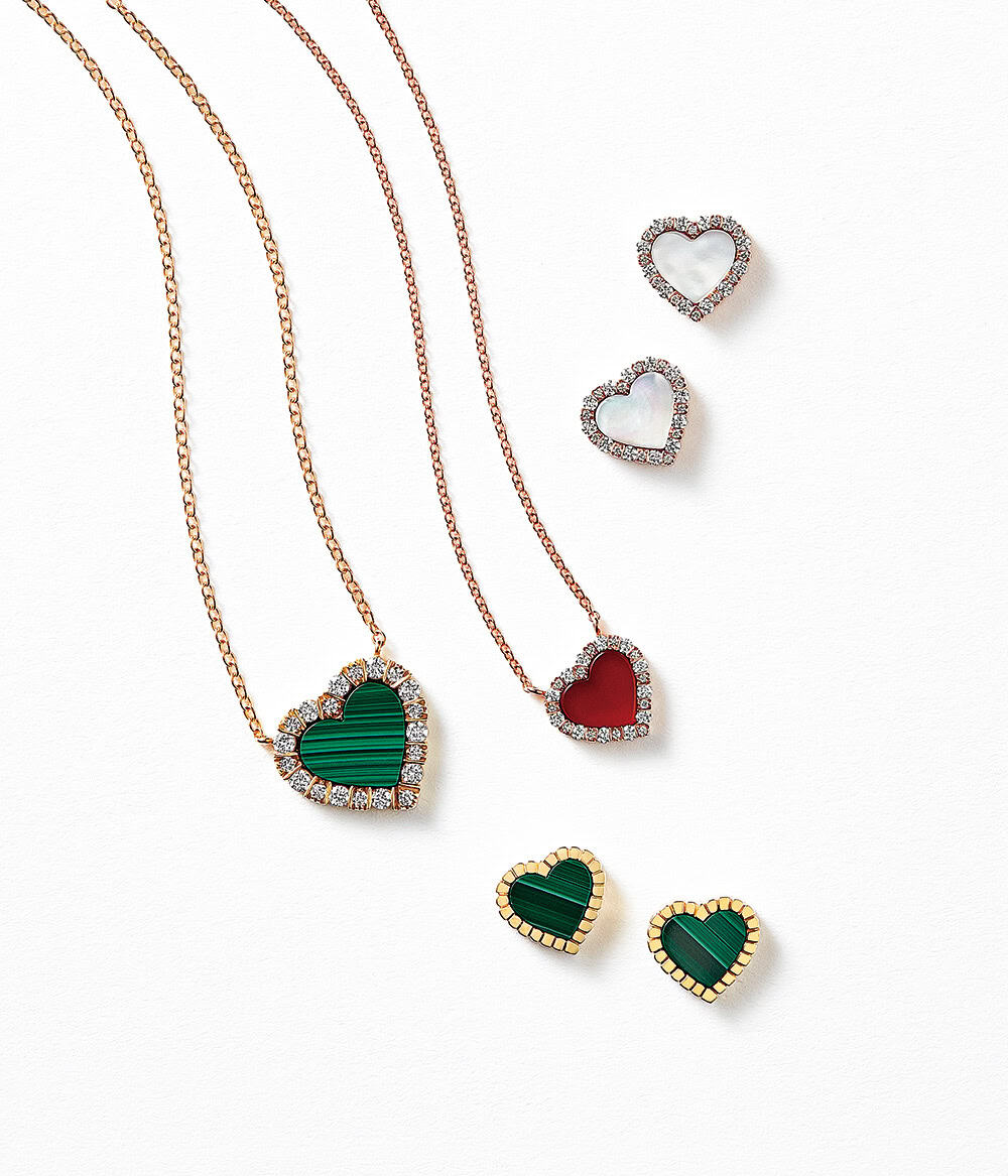 ハートモチーフ「ベル エポック」ピアス上〈PG×DIA×マザーオブパール〉¥668,800ピアス下〈YG×マラカイト〉¥470,800ネックレス右〈PG×DIA×カーネリアン〉¥525,800ネックレス左〈YG×DIA×マラカイト〉¥712,800(すべてダミアーニ/ダミアーニ・ジャパン)