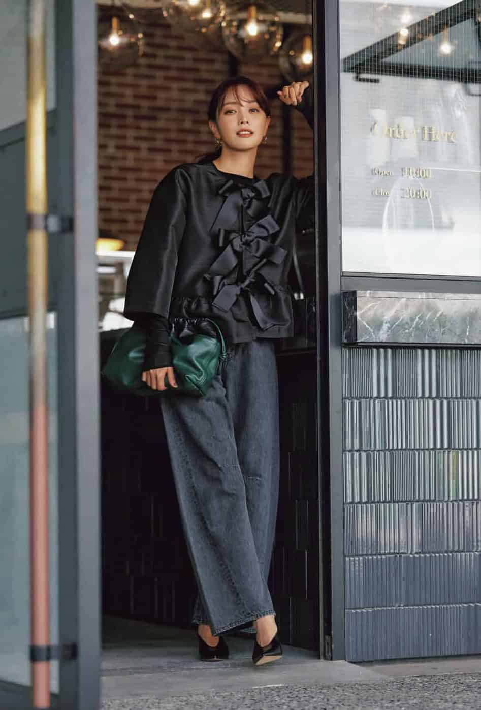 主役級ビッグリボンの可愛さを受け止めるのは、トレンド大本命ダークグレーのデニムパンツ。甘いディテールを、パンツの持つモード感と機能美で中和することで、40代のための華やぎバランスが完成します。
