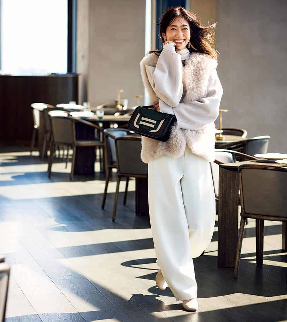ベスト[NEWoMan高輪店限定カラー]¥99,000コート¥63,800(ともにプルミエ アロンディスモン/プルミエ アロンディスモン NEWoMan新宿店)ニット¥31,900(エブール/リトルリーグ インク)パンツ¥26,400(LE PHIL/LE PHIL NEWoMan新宿店)バッグ¥187,000(ピエール アルディ/ピエール アルディ 東京)ブーツ¥28,600(ダイアナ/ダイアナ 銀座本店)ピアス¥52,800(ブランイリス/ブランイリス トーキョー)リング[右手]¥35,200〈Pearl for Life〉リング[左手]¥19,800〈スキャット〉(ともにロードス)