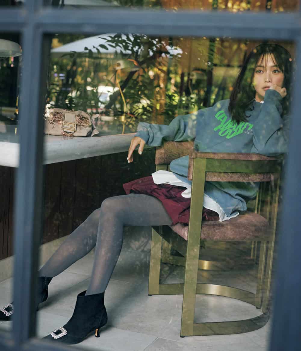 「フラット&スニーカーばかりでしばらくヒールから遠のいていましたが、最近、自然と目がいくようになり、ヒールに原点回帰中です。久しぶりだからこそとびきりキレイめなものが欲しくて、マノロ ブラニクのブーツを購入。キラキラの高揚感×きりっと締まったシャープなポインテッドトウが今の気分にFit 」と蛯原さん。ジュエリーを纏ったような煌めくバックルに、モダンなキトゥンヒールとポインテッドトウがグッドバランス。プリントスウェット×ミニスカートのカジュアルコーデに大人の品格をもたらして。